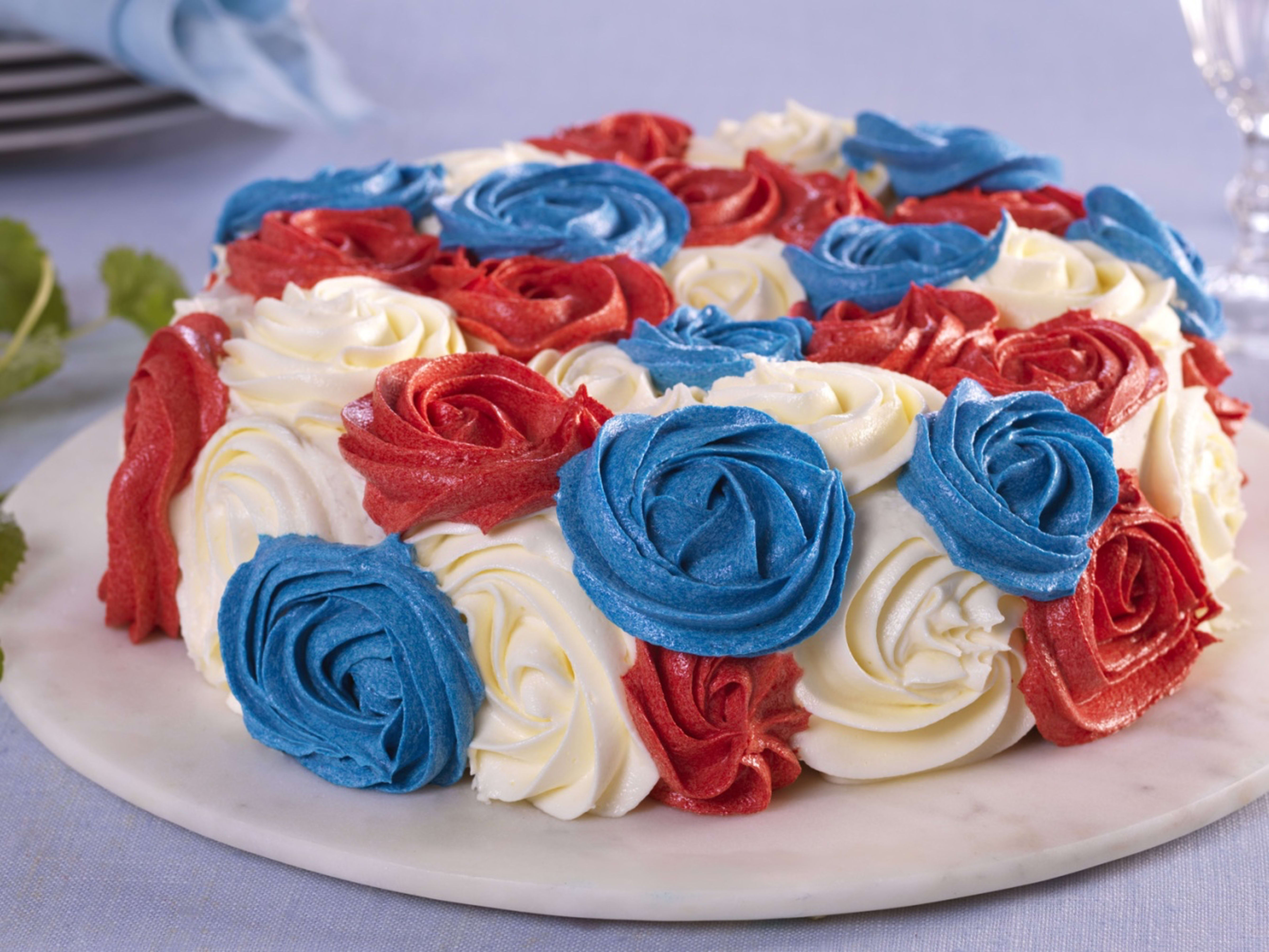Makroner i rødt, hvitt og blått med ostekrem og popping candy