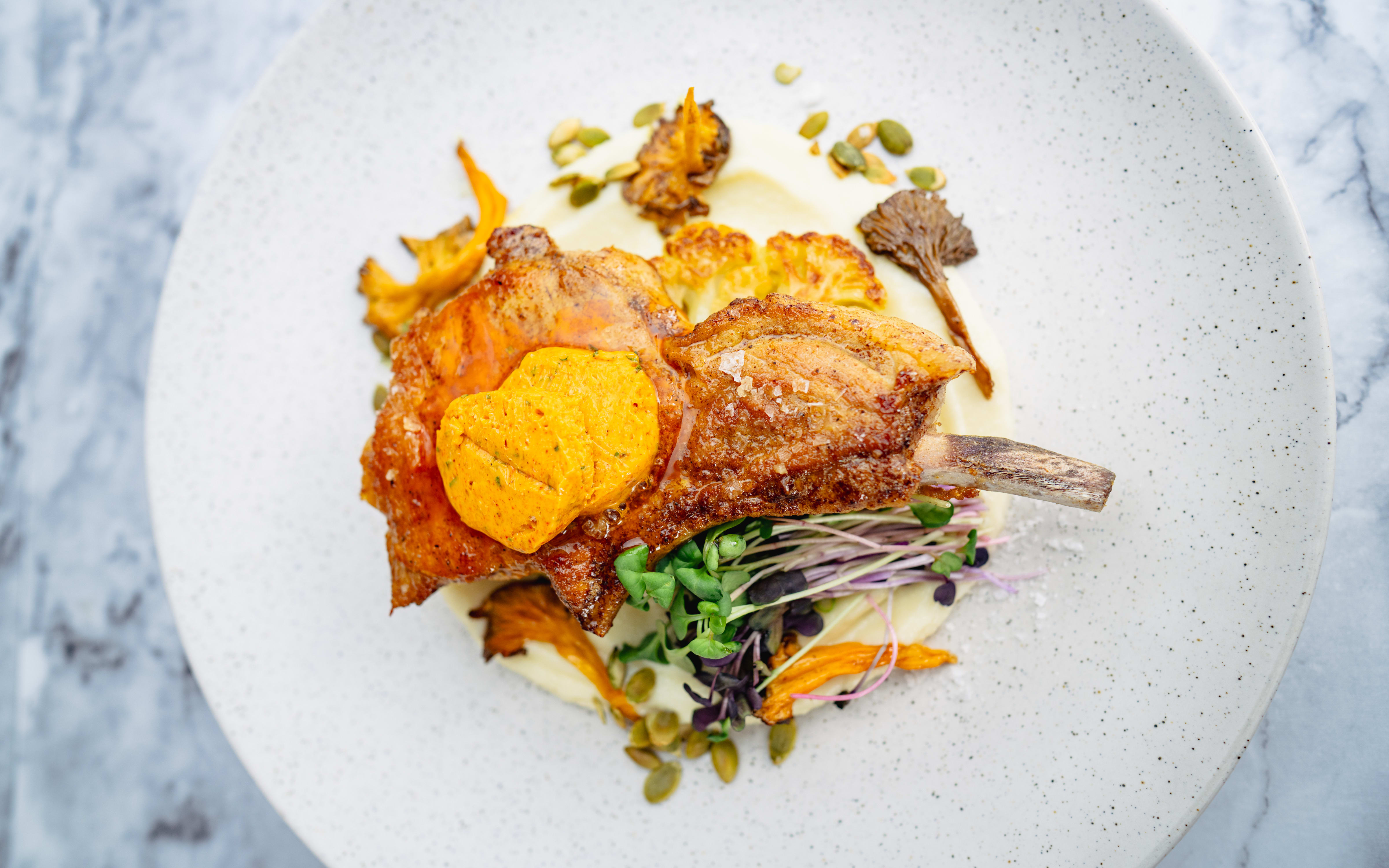 Nå er det klart for å montere! Begynn med å legge blomkålpuré på tallerkenen og stryk det litt utover. Legg på et stykke blomkålbiff med en kotelett svinecarré over. Topp med et godt stykke Bremykt kryddersmør og la det smelte over. Nam!