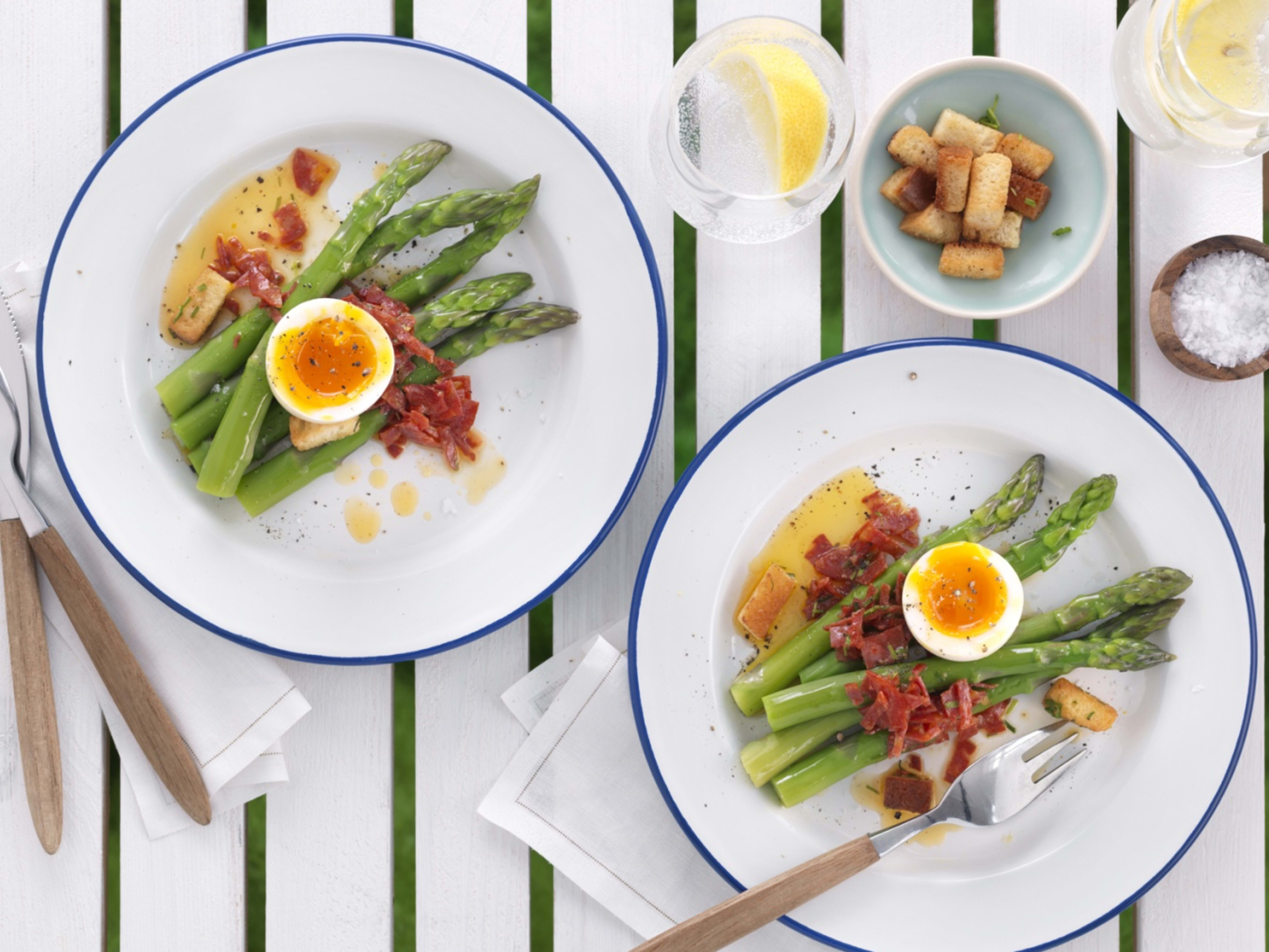 Legg aspargesen på et stort fat eller på fire tallerkener, fordel chorizosmør over. Del eggene forsiktig i to og legg et halvt egg på hver tallerken over aspargesen. Dryss over krutonger og gressløk.