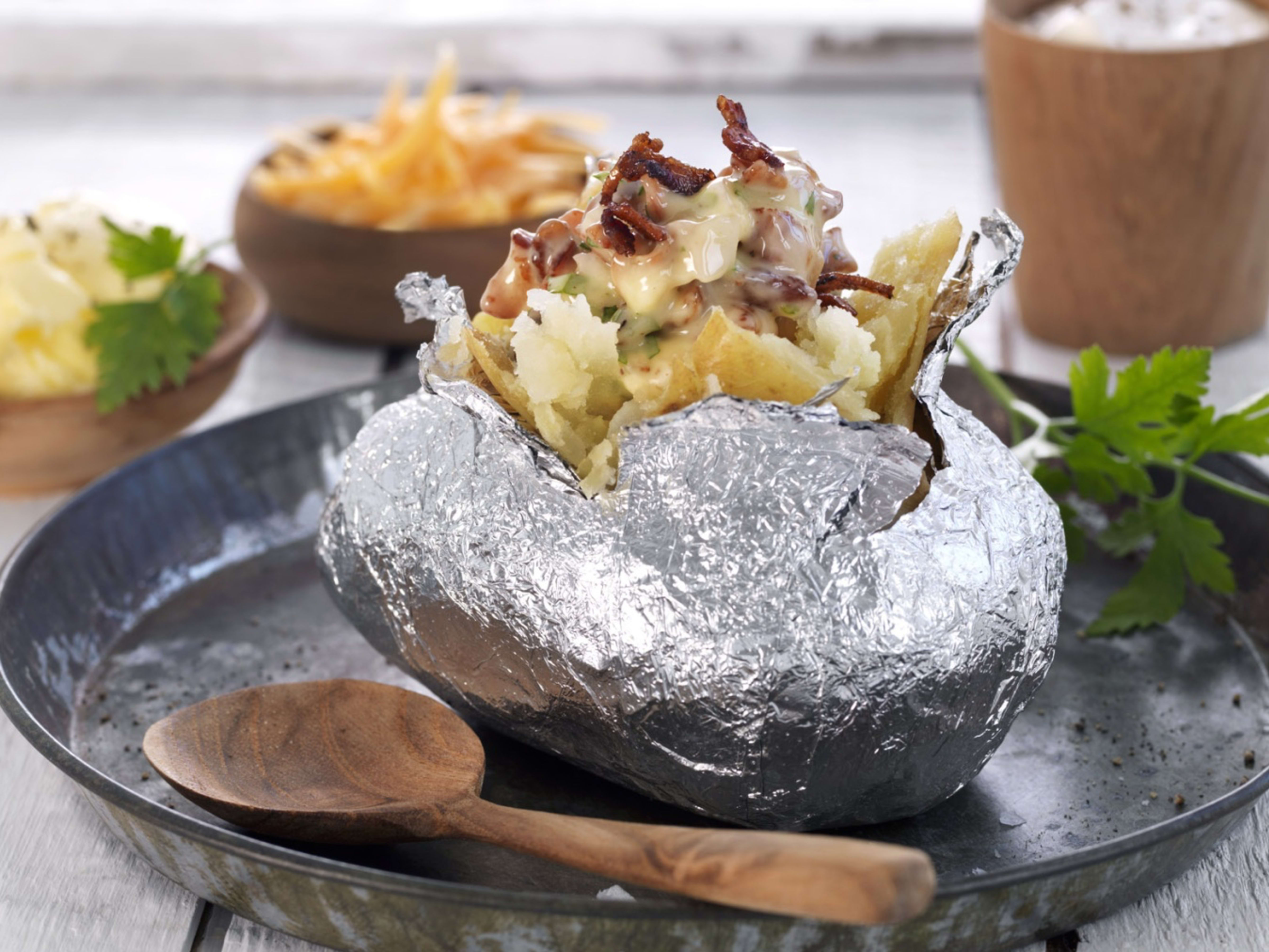 Lag et stort kryss i potetene, ha i litt baconsmør og dryss over cheddar. Server gjerne med litt rømme.
