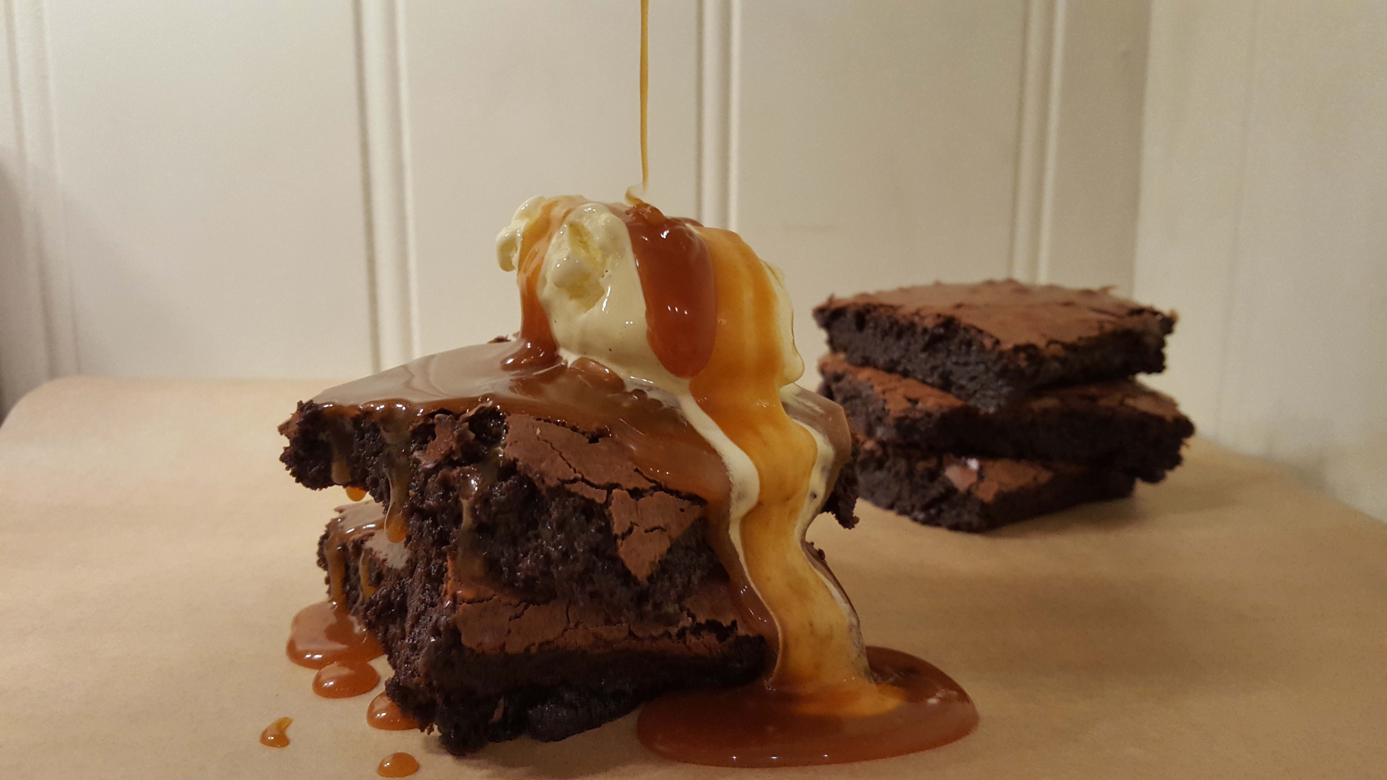 Mix sammen egg og sukker med en mixmaster eller i en kjøkkenmaskin. Bland sammen alle de tørre ingrediensene i en bolle. Smelt smør. Når smøret er smeltet, trekk det bort fra varmen og ha i sjokoladen. Bland vekselvis inn det tørre og smør/sjokolade i egg og sukkerblandingen.
