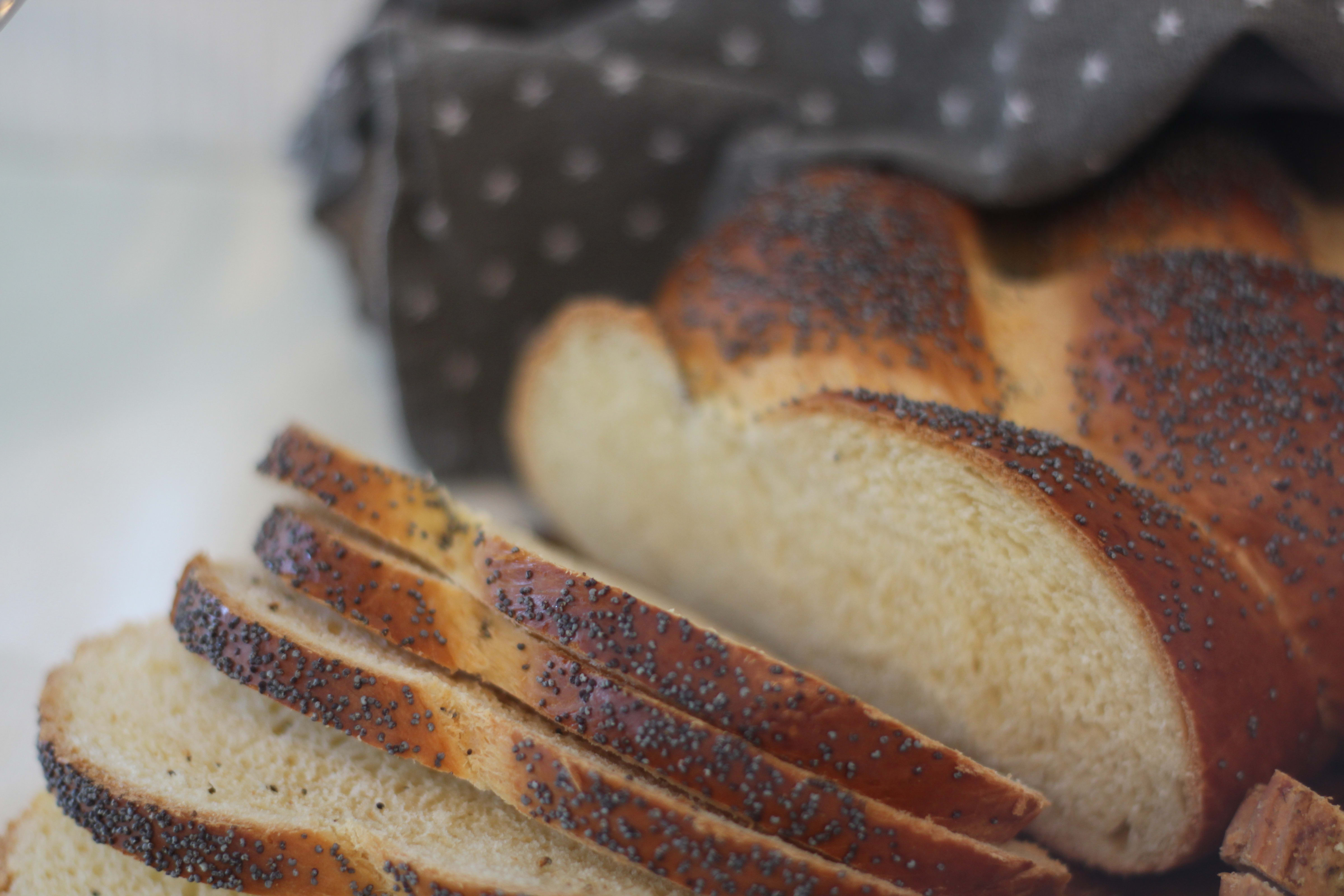Når brødet er ferdig hevet, pensle med sammenvispet egg og strø på valmuefrø.