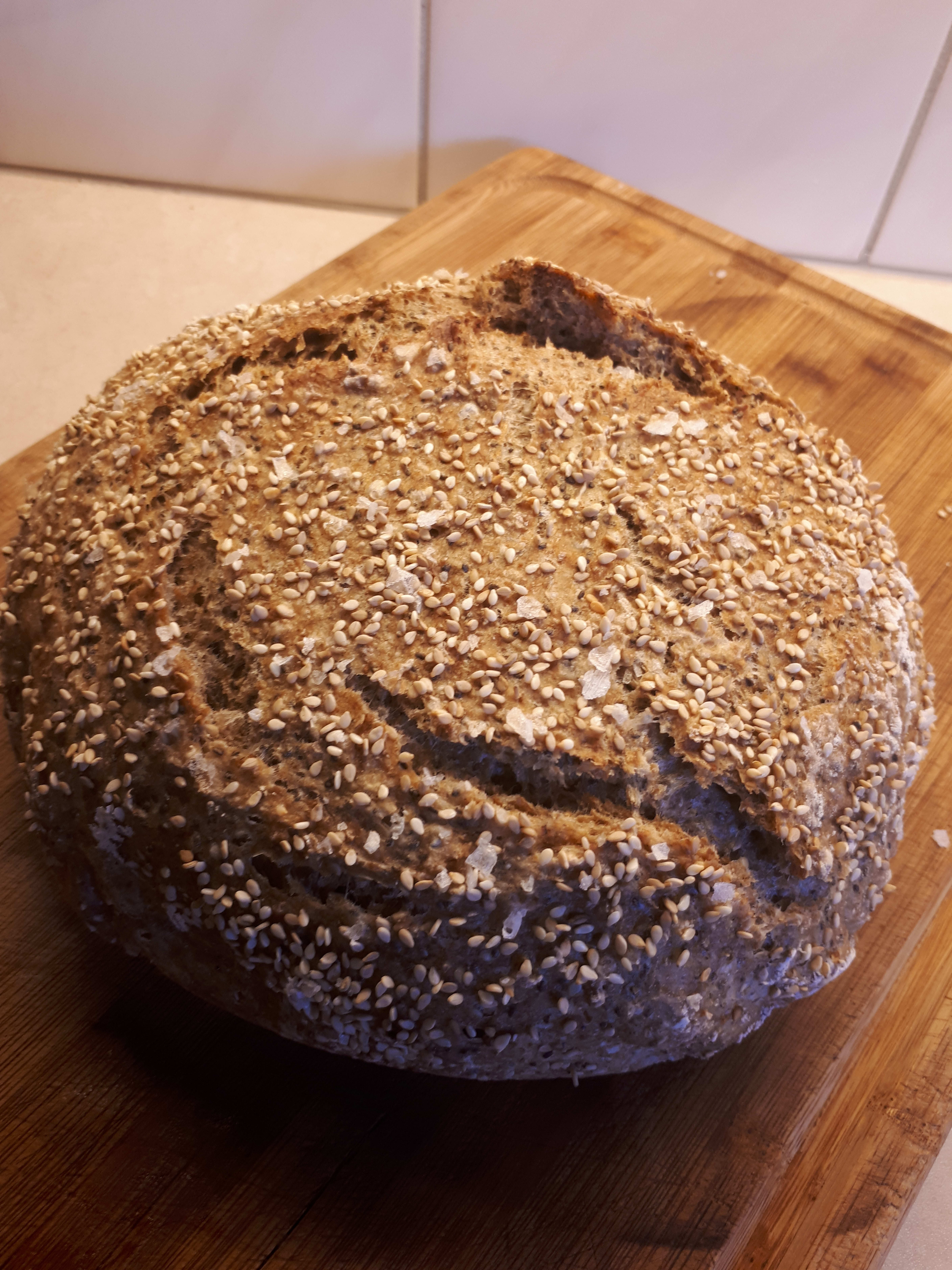 5. Ta gryten ut. Ha et stekepapir i bunn, og velt over deigen i gryten. Brødet kan toppes med frø, evt litt maldonsalt.
