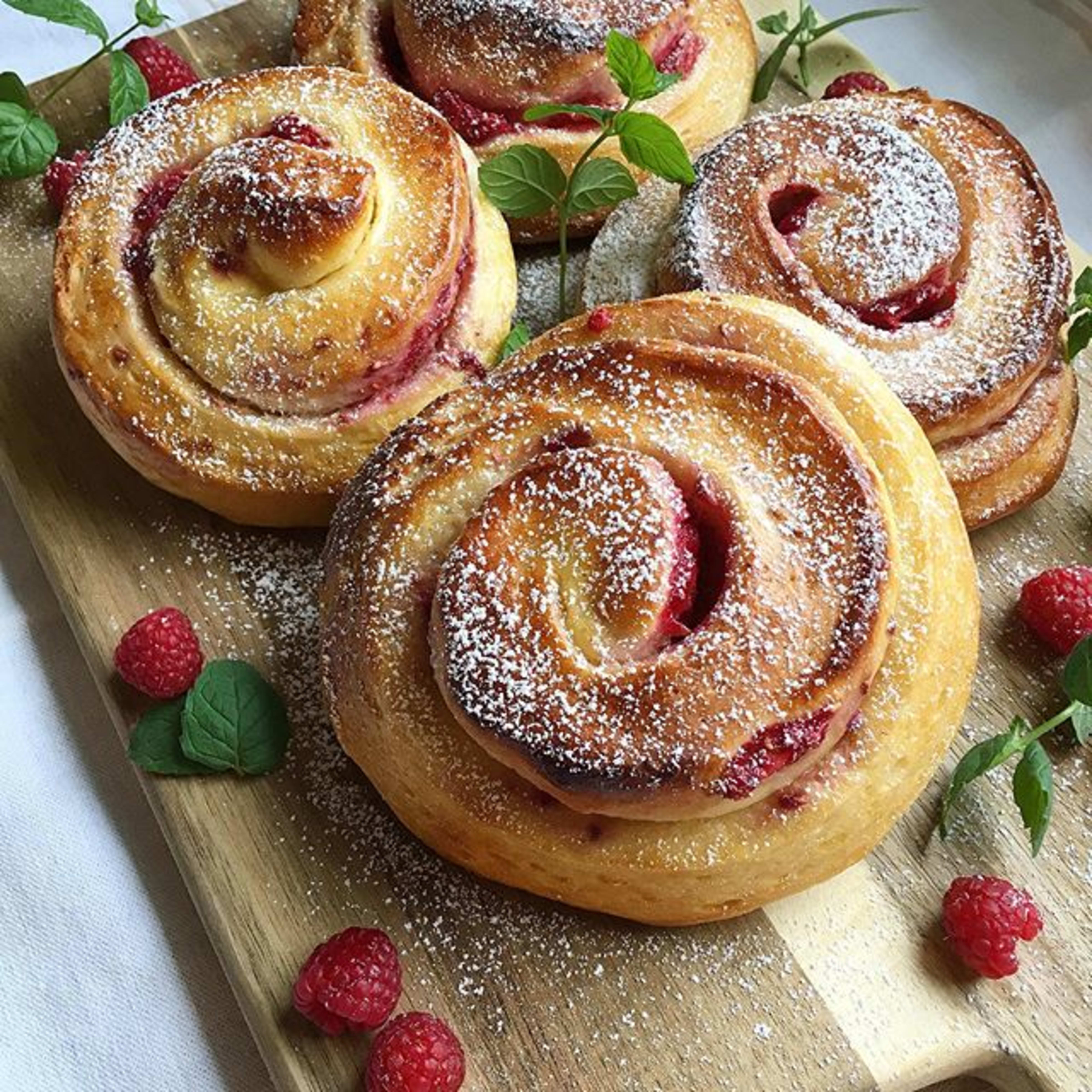 Sett stekovnen på 210 grader. Kjevle ut deigen på melet bord til en rektangel. Smør på et tynt lag Bremykt og ha deretter over et tynt lag bringebærsyltetøy og noen hele bringebær. Rull sammen til en pølse og del i passe store emner. Dander på bakepapirkledd stekebrett. Pensle med egg. Stekes midt i ovnen i ca 10 min. Pynt gjerne med melis om ønskelig