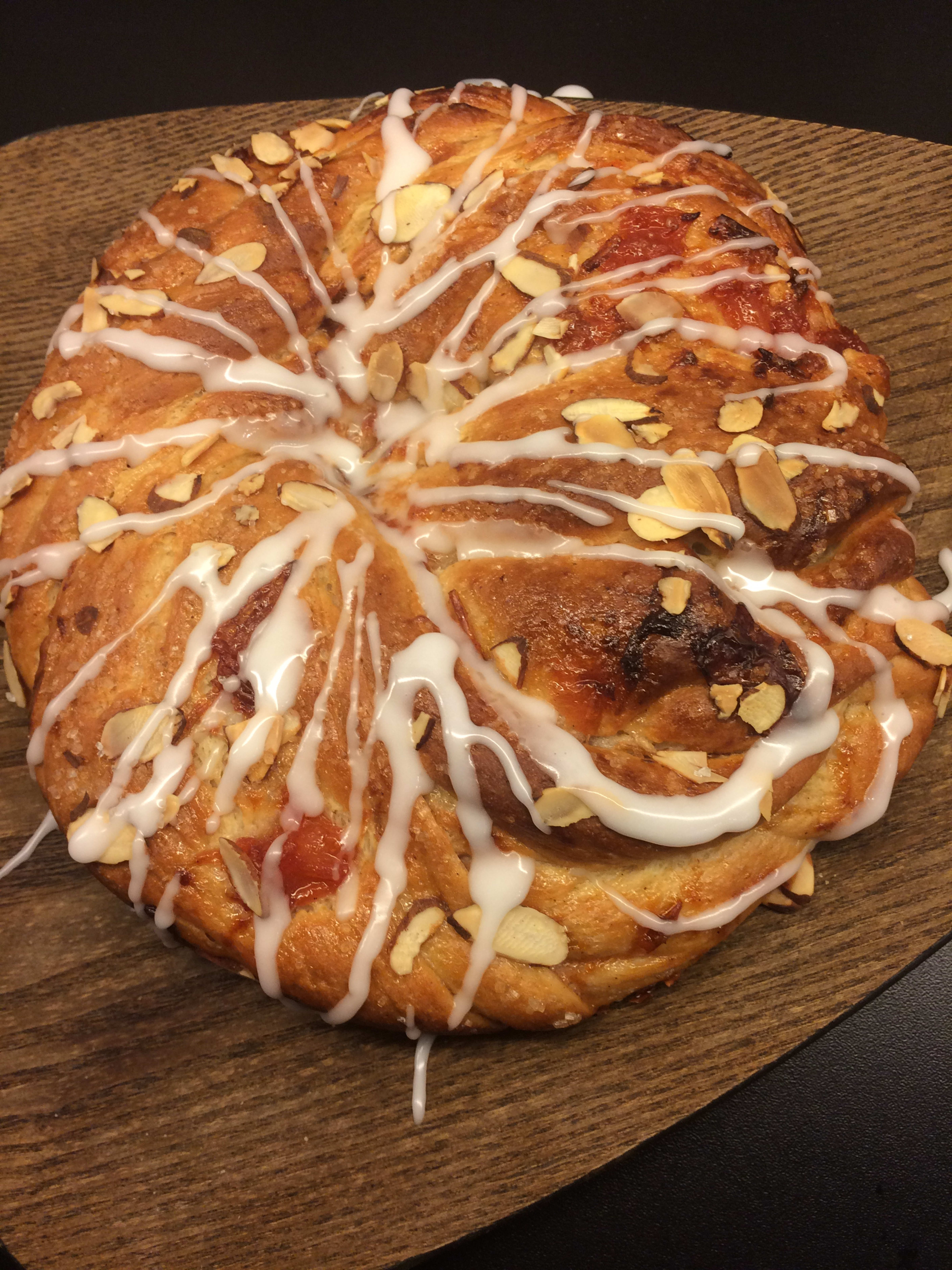 Kjør alle indigriensene sammen i en kjøkkenmaskin . Jeg brukte kaldt smør og kald melk. Kjør deigen i 10 minutter. Hev til dobbel størrelse. Lag syltetøyet: kok opp plommene med sukker, vaniljesukker og kanelstang. Kok til det tykner. Syltetøyet skal være syrlig pga av søt hvetebakst. Avkjøl. Kjevle ut til et rektangel. Smør ut syltetøyet på 2/3 av leiven. Rull sammen. Ta en kniv og del rullen på langs, men la det være litt sammen på den ene siden. Vri den rundt. Og form den som et hjul. Legg på bake plate. Sett ovn på 170 gr, hev i 30 min. Dryss på perlesukker og mandelflak. Stek i 30 min.