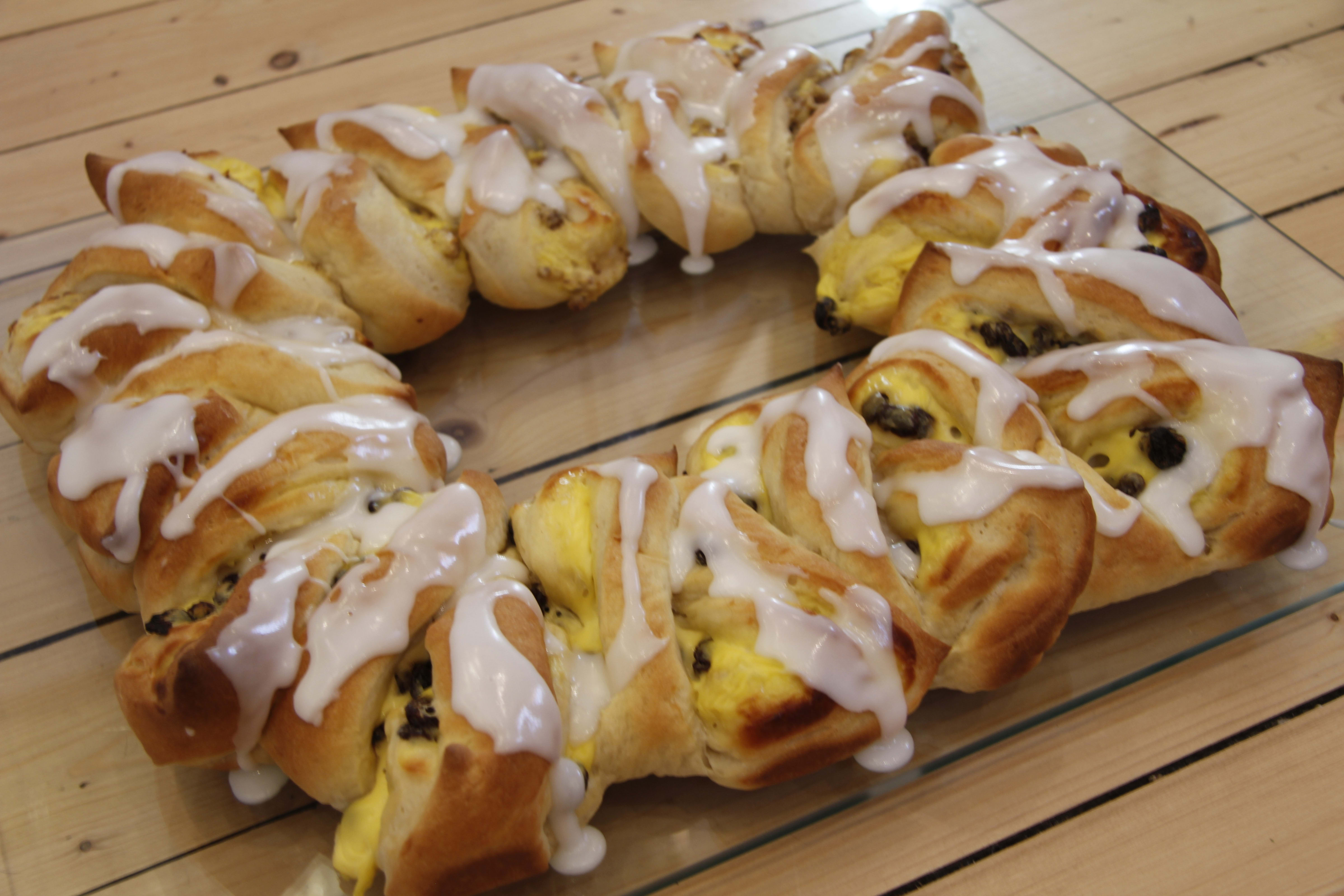 11. Smør halvparten av vaniljekremen i en stripe på hver del og bre litt utover før du strør over rosiner. Som en variasjon, kan man ha rosiner på den ene delen og bare vaniljekrem på den andre. Rull hver del til en pølse og legg dem på stekebrett med bakepapir i en oval sirkel. Klipp hakk på skrå inn og brett flikene bakover vekselvis til høyre og venstre hele veien rundt.