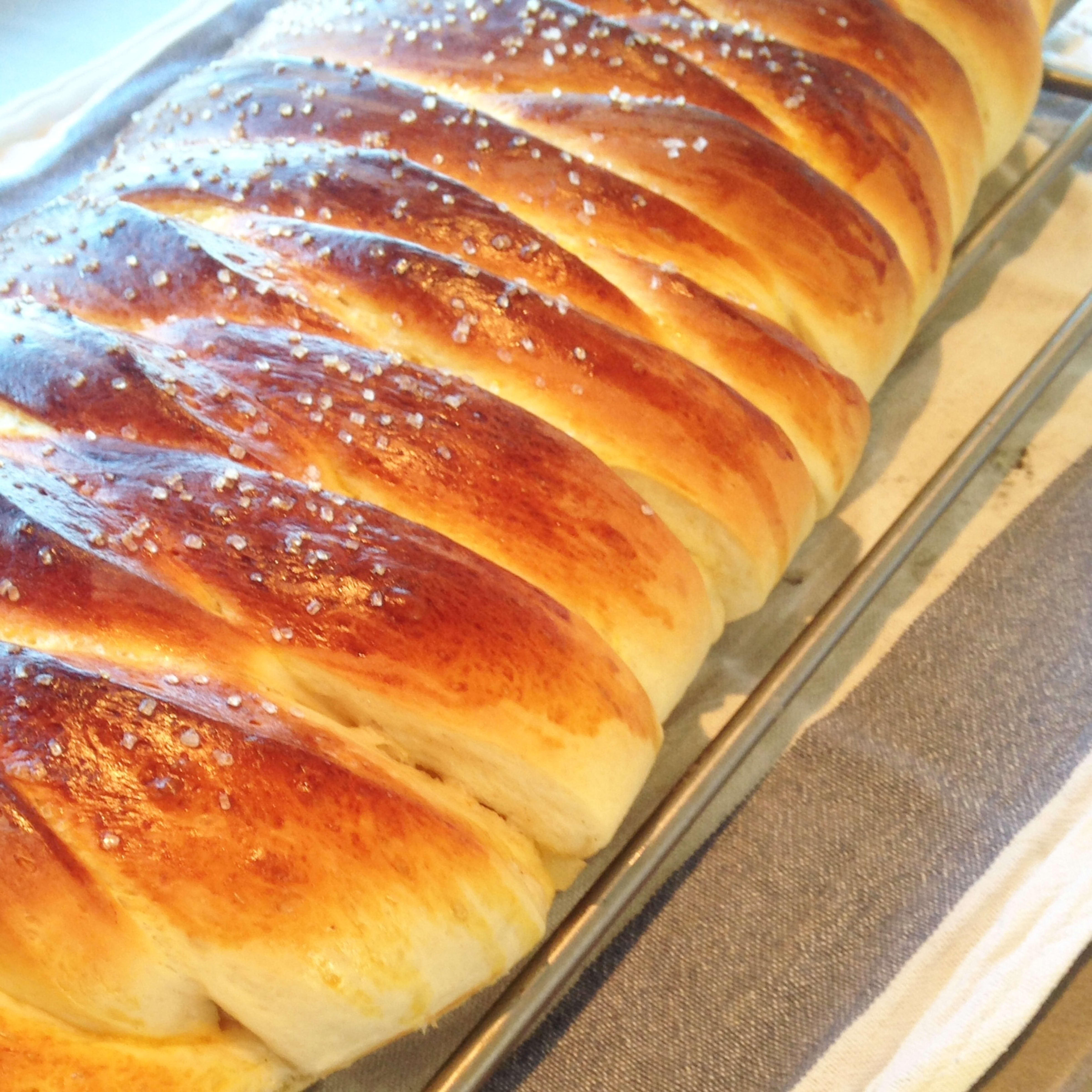 Ha deigen over på benken og kjevl til et rektangel. Skjær 1/3 inn på skrå langs begge sider av deigen. La det være igjen en rand på midten hvor du smører ut fyllet. Flett så annenhver flipp inn mot midten. Brett kransen i endene slik at fyllet ikke renner ut under steking. Sett hvetestangen til heving i ca 45 min. Pensle med egg, strø over perlesukker/hakkede mandler og stek på 200 grader i 25 min. Avkjøles på rist.