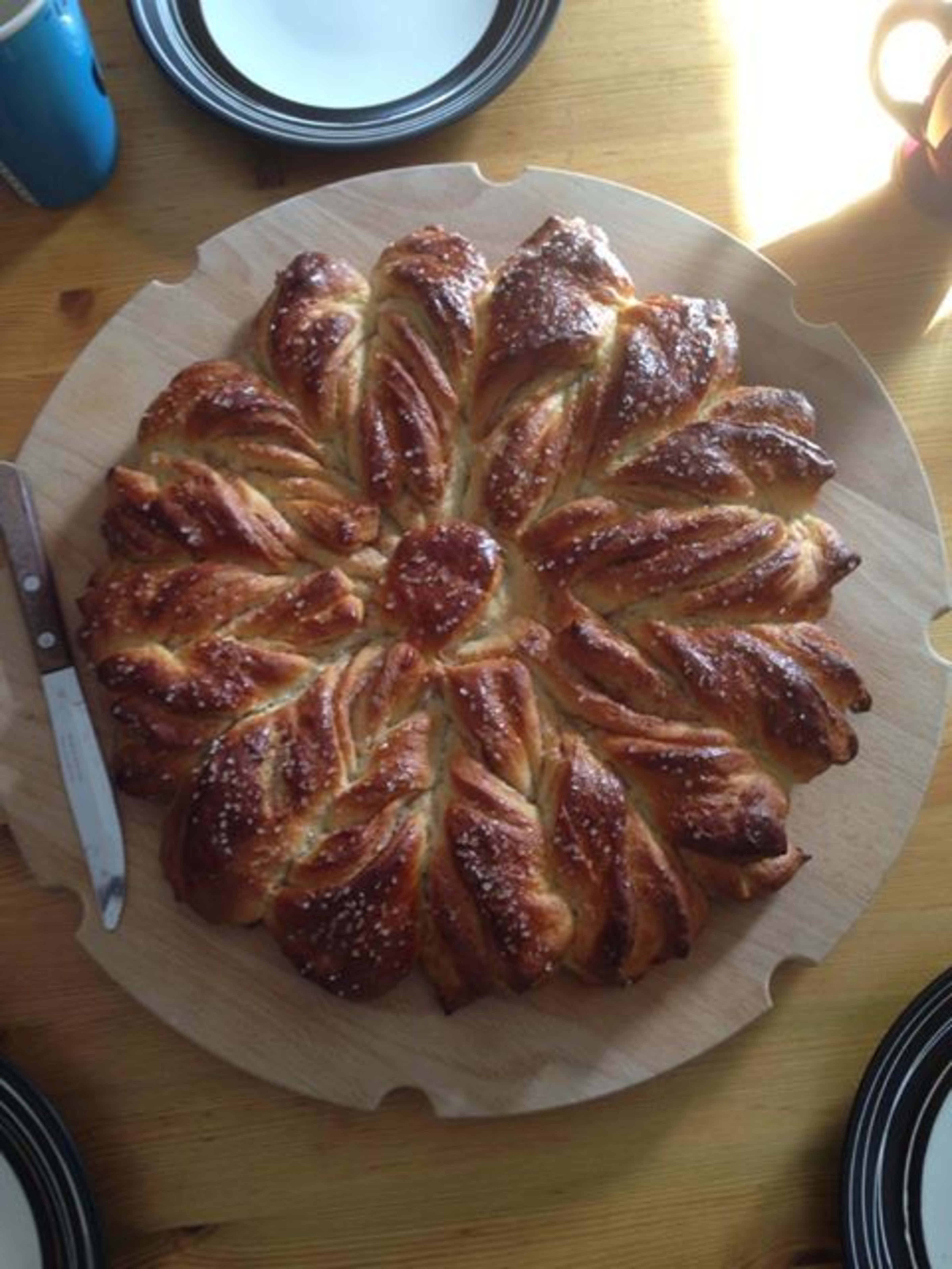 bland det tørre, smelt smøret og bland med melk blandingen skal være fingervarm, rør ut gjæren i blandingen og bland med det tørre, sett til heving, la den stå en halvtimes tid, dekk til med plast. - del deigen i tre, deigen kan virke litt løs men ikke tilsett mer mel , jobb den sammen med ørlitegranne mel på bordet, da blir den veldig smidig, del deigen i tre, ta en del og kjelve ut i en runding som dekker stekeplaten, smør litt smør på leiven og strø på sukker og kanel, neste del kjevles på samme måte og legges over, gjennta smør/sukker/kanel, legg på del 3. Ta så ett glass å sett i midten og klipp deigen i tolv like deler, ta to og to og snurr mot hverandre og klem de litt sammen i ytterkant. La den etterheve litt, smør med egg og strø perlesukker over før den stekes i 200grader ca 20 min :)