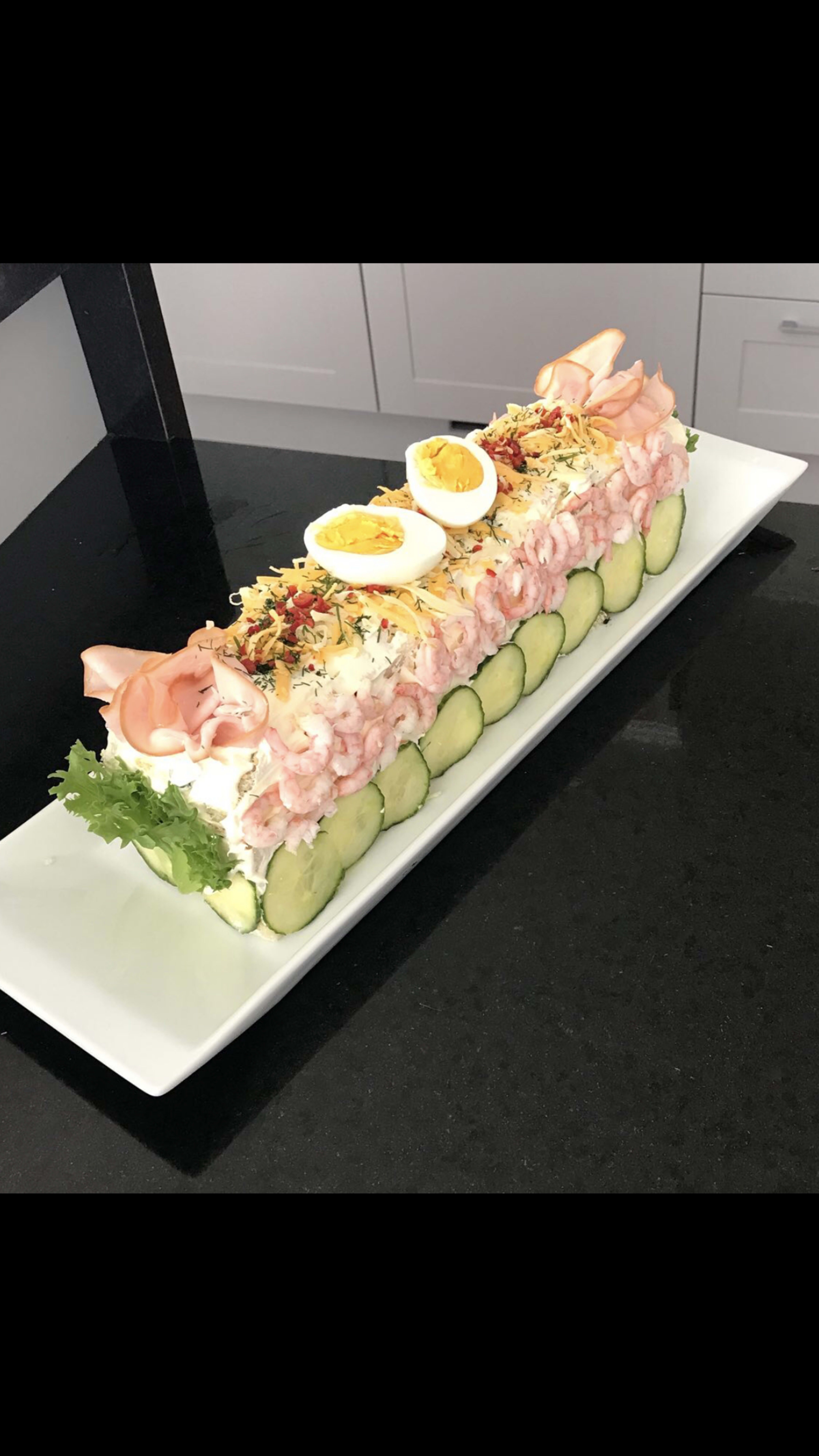 Deretter kjære brød med høyde 1 cm og legg et lag med brød, ett lag Bremykt smør og et lag med røret og fortsett med tre eller fire lag. I det siste laget, ta en liten saus over og rundt kaken. la den sitte i kjøleskapet i to til tre timer for å smake og til slutt pynte smørbrød med egg, reker og hakkete dill/tørke dill.