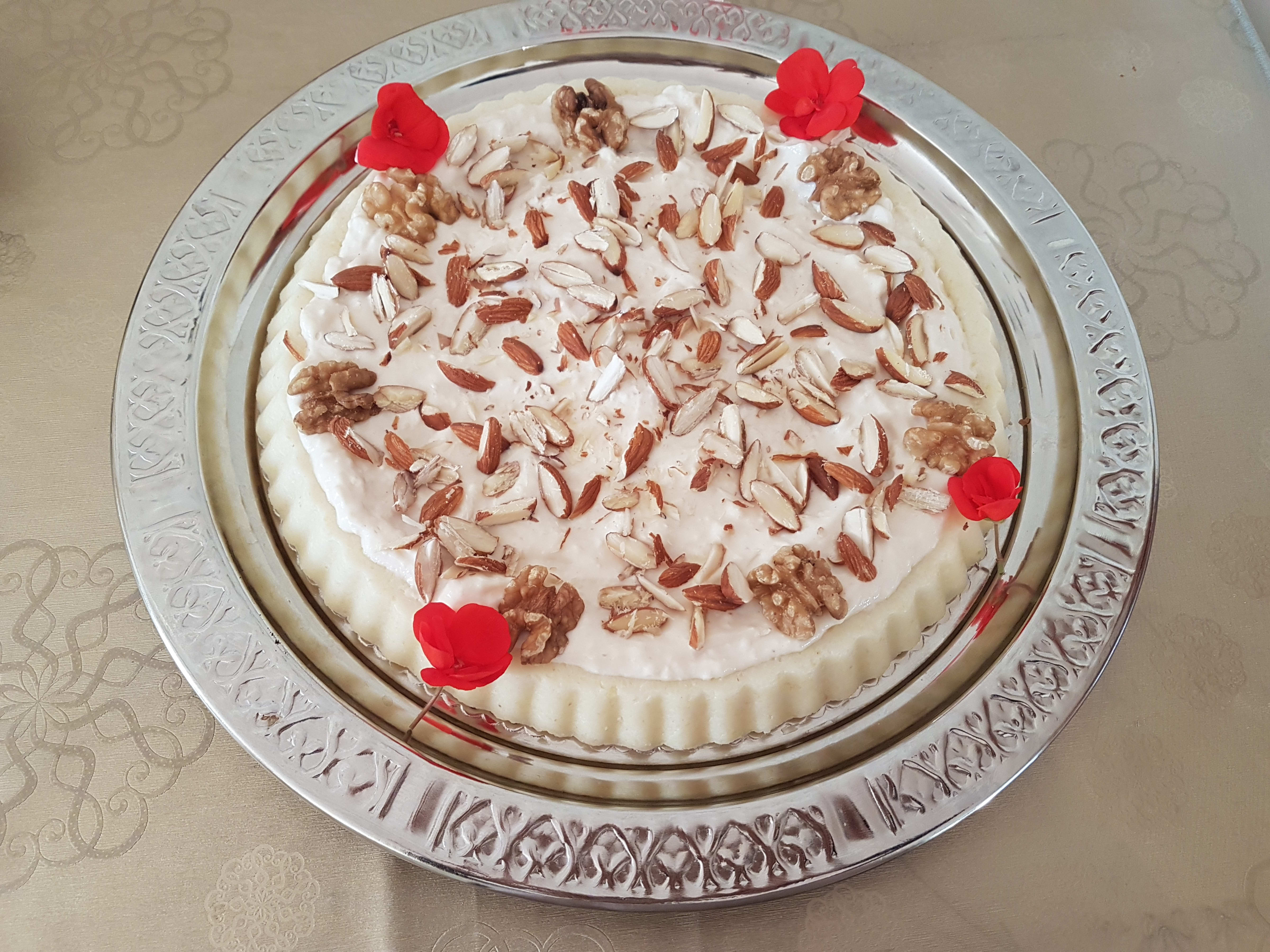 Kokos, mandler og/eller valnøtter til pynt. Spiselige blomster ser også nydelig ut som pynt.