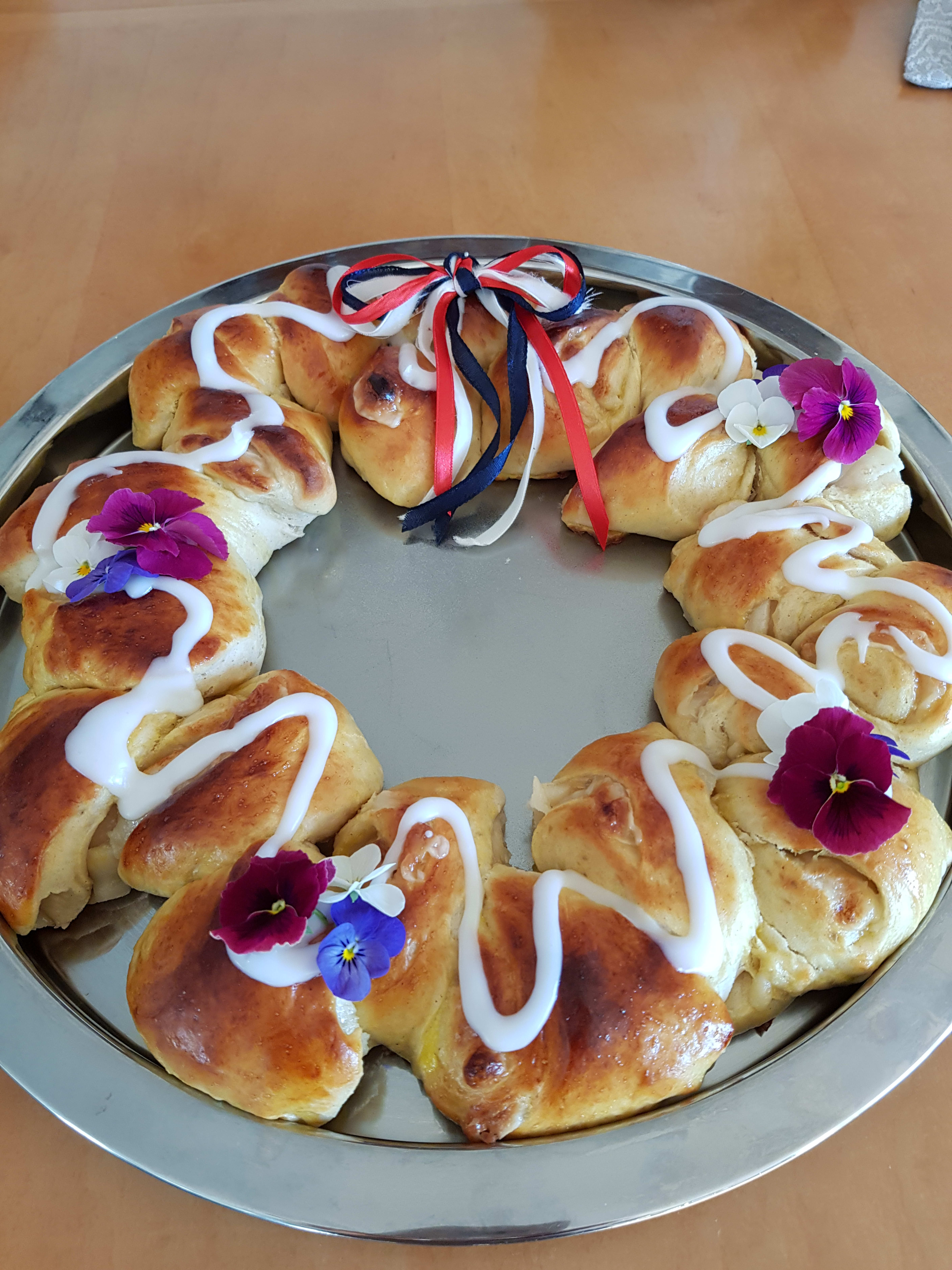 Kan deigen sammen mår den er ferdig hevet og trill den til en lang pølse. Kjevle den flat, som til kanelboller, legg tynne skiver marsipan midt på deigen, gjerne 2 rader og rull deigen sammen igjen til en pølse. Lag en ring av deigen på stekebrettet og klipp snipper rundt hele ringen. Vri snippene annenhver gang til høyre og venstre.