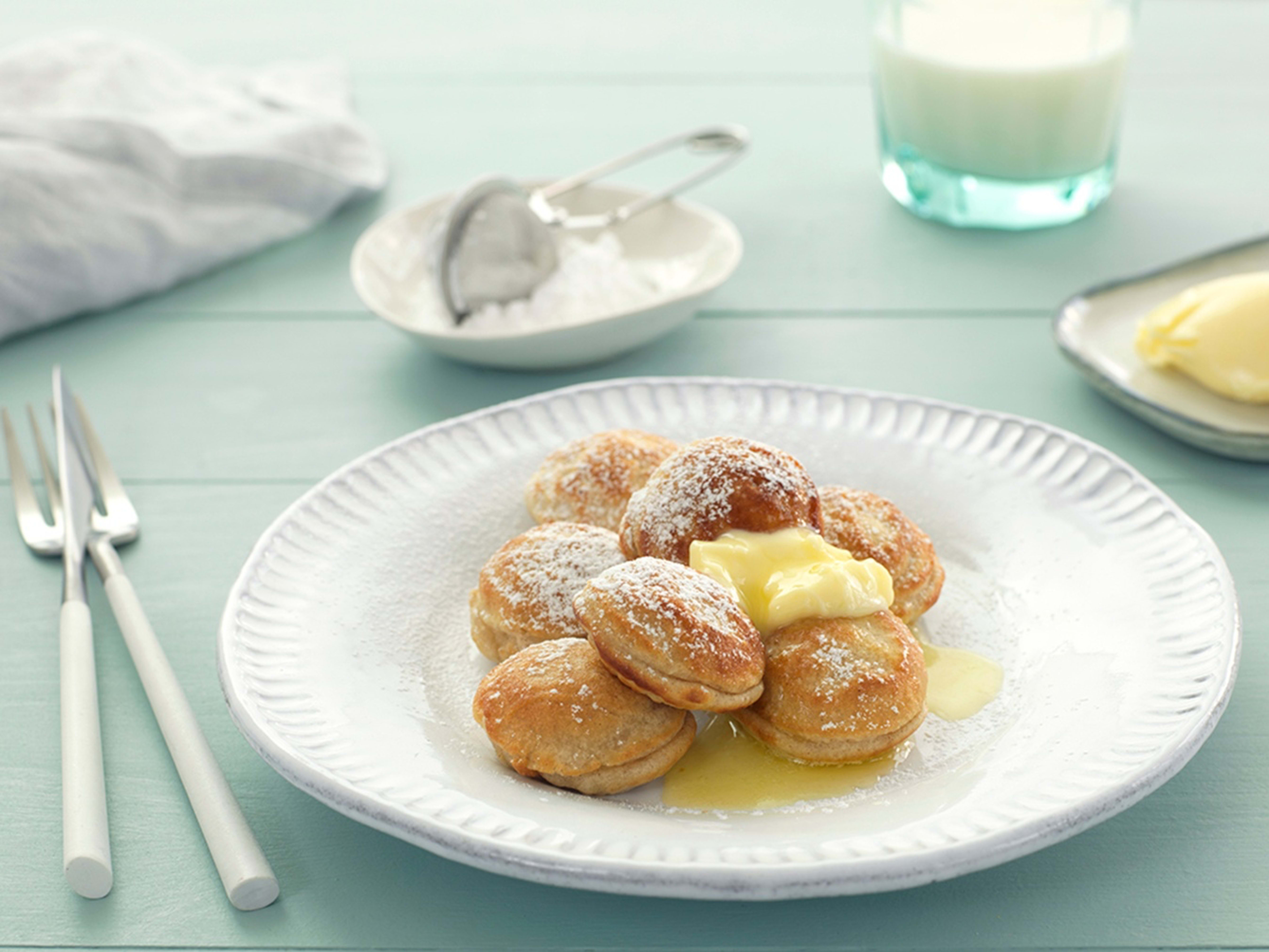 Visp sammen egg og melk, spe med de tørre ingrediensene og visp til en glatt røre. Stek små poffertjes i en munkepanne (evt. stekepanne) på middels sterk varme, med litt Bremykt i hver fordypning (bruk ca. 1 ss røre per stk). Stek til de små pannekakene har stivnet på toppen, snu. Serveres varme med Bremykt og ett godt dryss melis.