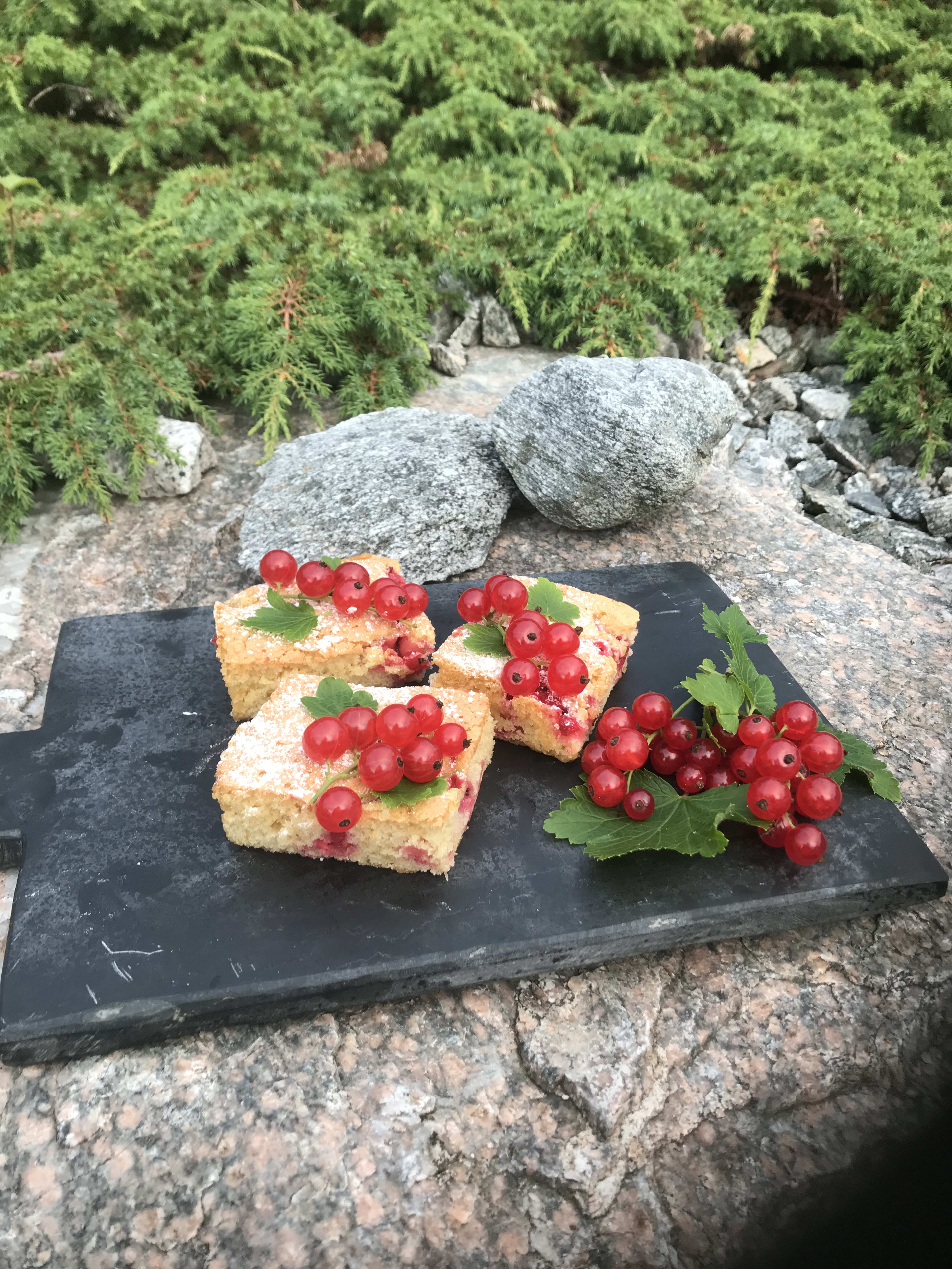 Sett ovn på 175 grader og bruk ei langpanne 25gange 35 cm ,smelt Bremykt og melk , pisk egg og sukker til eggedosis ha i smørblandingen med kardemomme i eggedosisen , bland alt det tørre å sikt i røren å rør forsiktig , hell røren over i form med bakepapir , ha på 4-5 dl rips på røra å sett i ovnen på nederste rille i ca 30 min , ta ut å la den avkjøle litt pynt med rips og melis 👍veldig Go å syrlig kake å lett å lage 😀