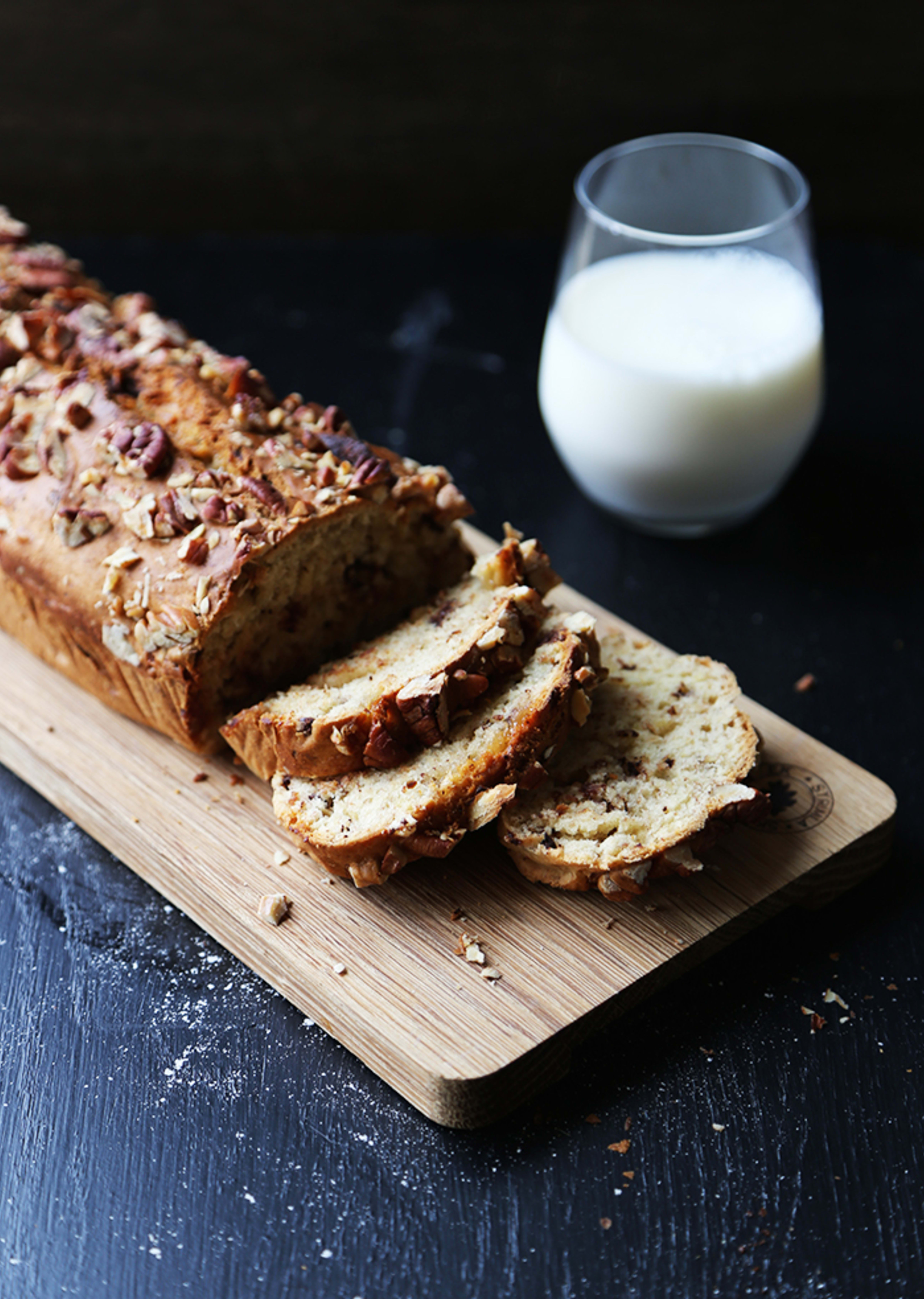 3. Hell røren i 2 smurte brødformer og strø over nøttene. Stek i ca 1 time (på 180 grader). Ta brødene ut av ovnen og la de hvile i formen i ca 10 minutter før du legger de på en bakerist.