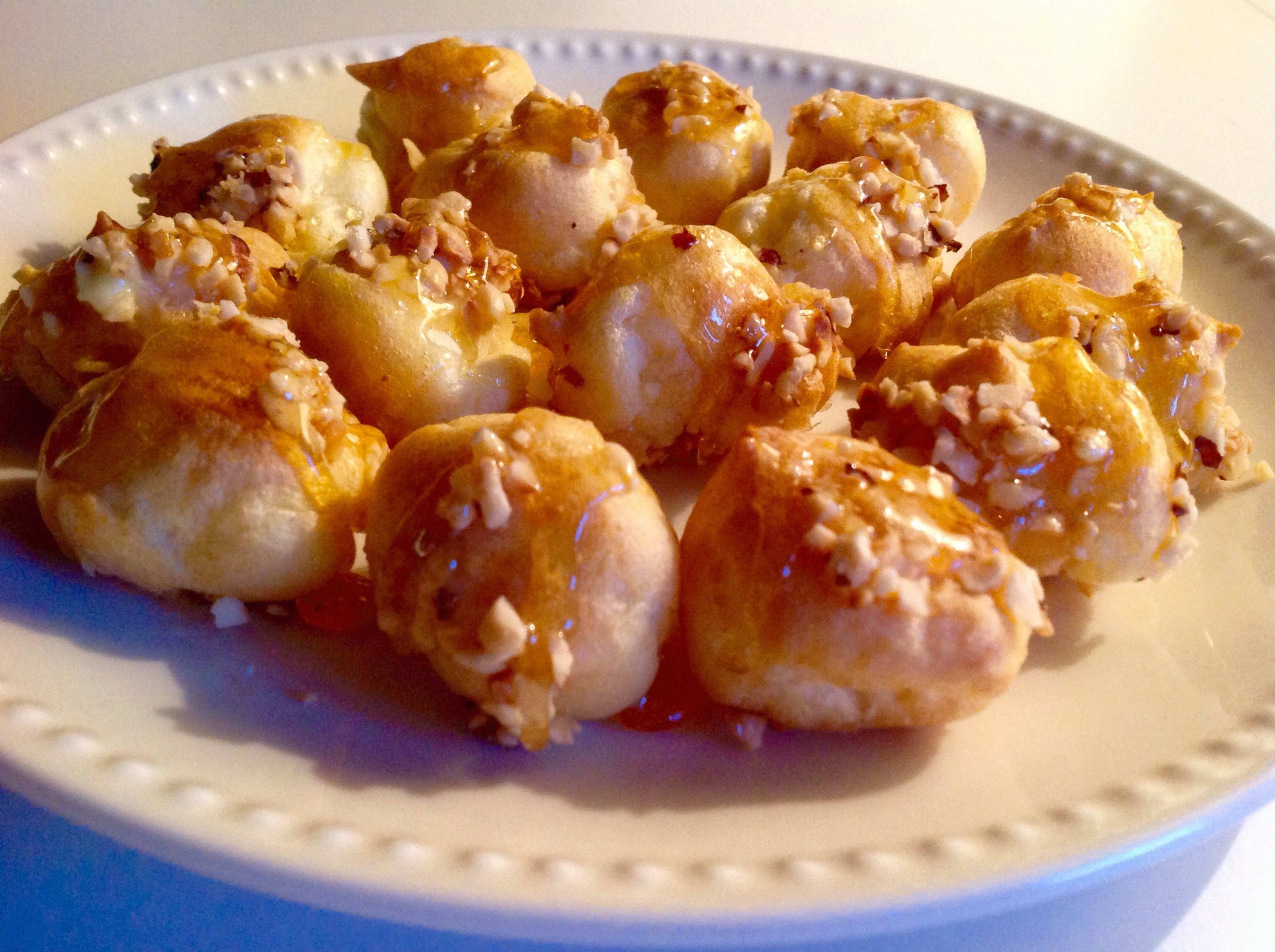 8.Med hjelp av en skje heller du karamellen raskt over vannbakelsene .