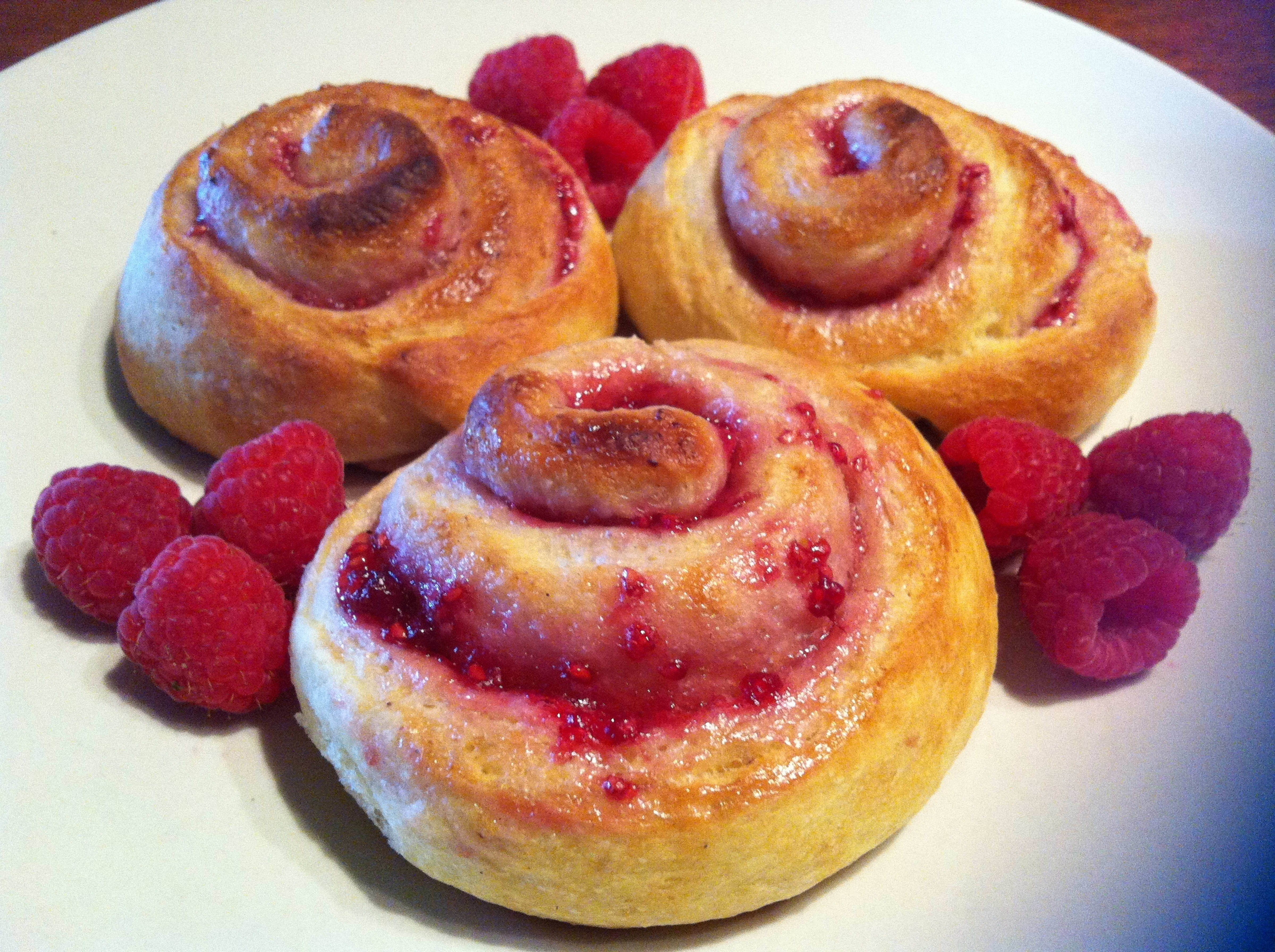 Bland sammen det tørre. Smelt smør og hell over melken. Rør det våte inn i det tørre og elt godt. La deigen heve i ca en time, til dobbel størrelse. Kjevle ut deigen til et rektangel og smør den med bringebærsyltetøy. La det være noen cm uten syltetøy på den ene langsiden. Rull sammen deigen fra langsiden med syltetøy mot langsiden uten syltetøy, slik at den er lett å feste sammen. Del rullen i 25 biter. Sett dem på stekebrett og la dem etterheve i ca 30 min. Stekes på 225 grader i ca. 10 min eller til de er gylne.