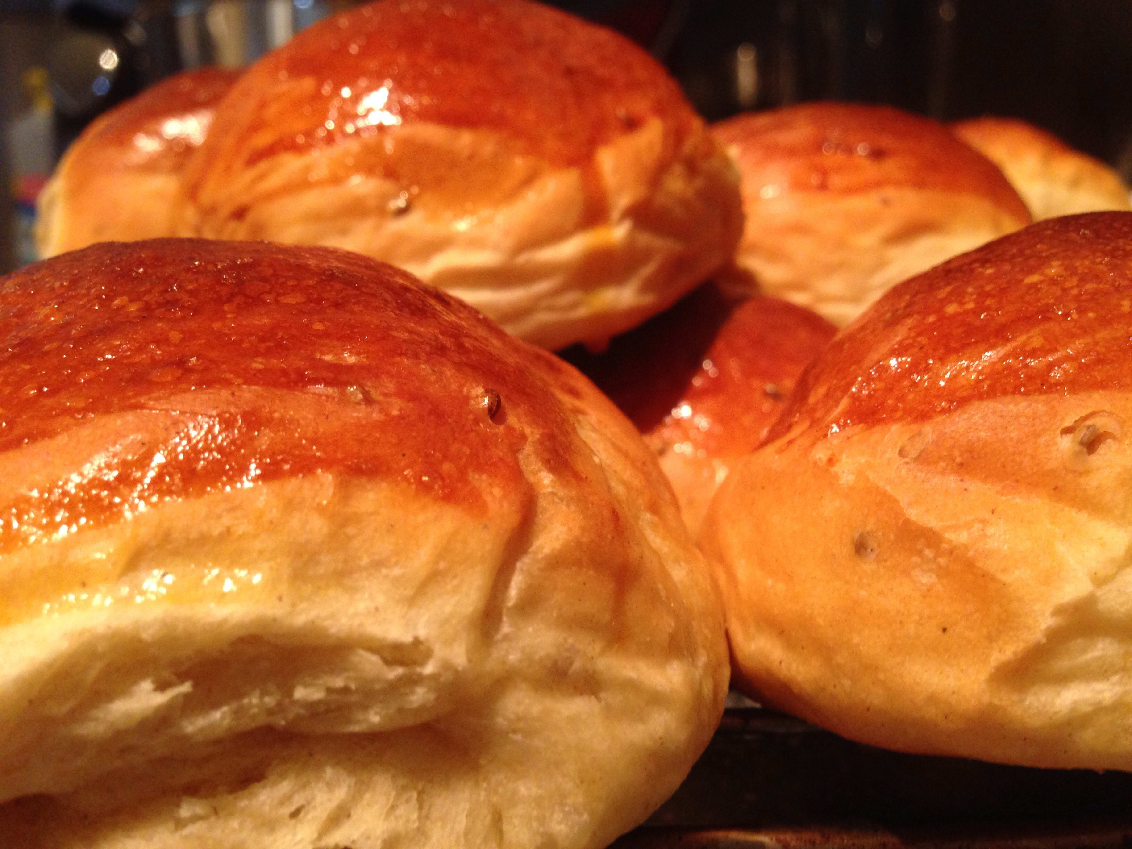 9) Stek på 225 grader (over og undervarme) i ca. 12 minutt. Obs! Ta ut bollene og pensle dem med romtemperert egg når de har stekt i fem minutter. Sett inn bollene igjen og stek ferdig.