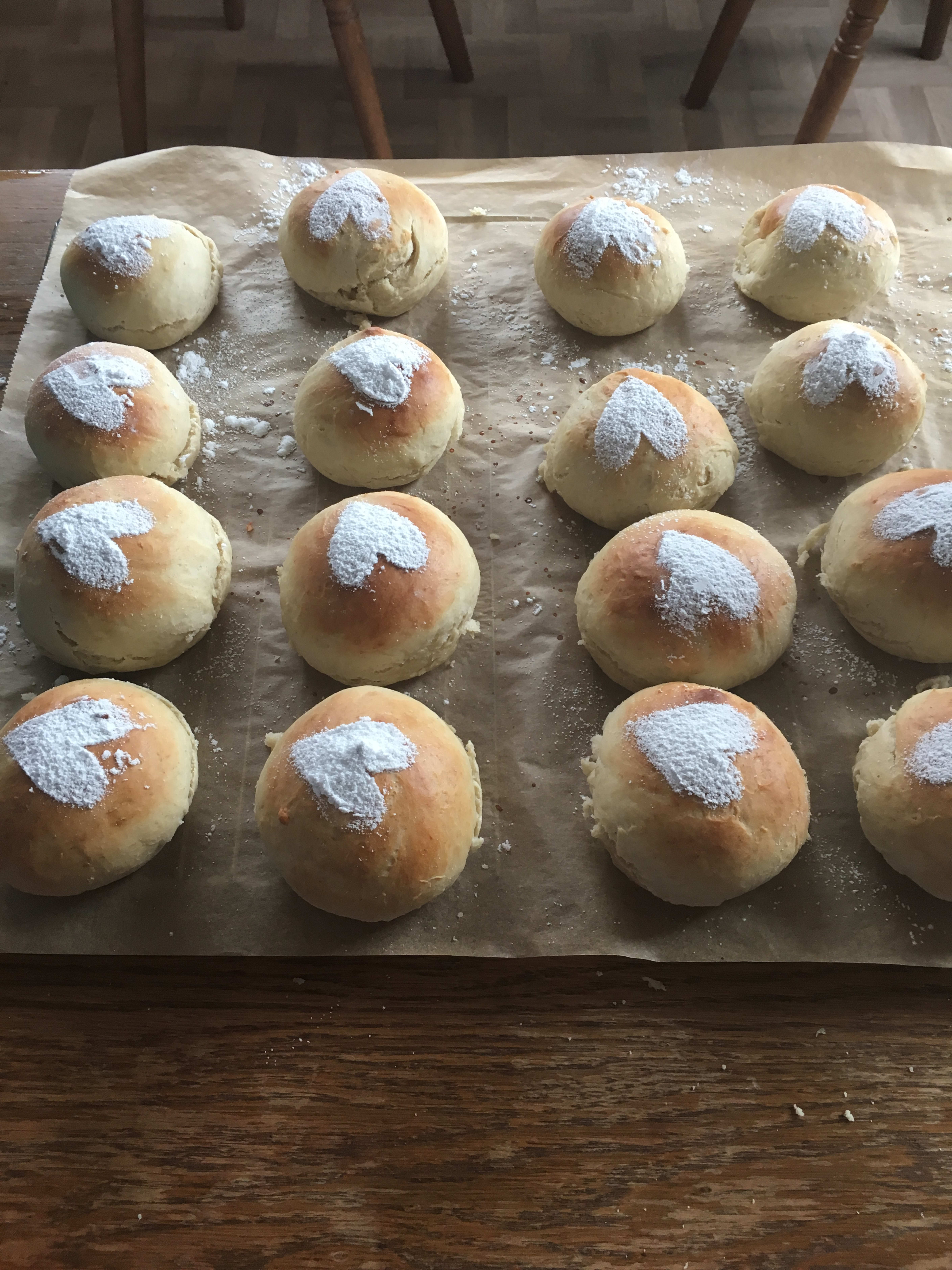 7. La bollene avkjøle seg i ca 10 minutter. Klipp ut former eller figurer av et ark, legg så arket over bollen og dryss melis.