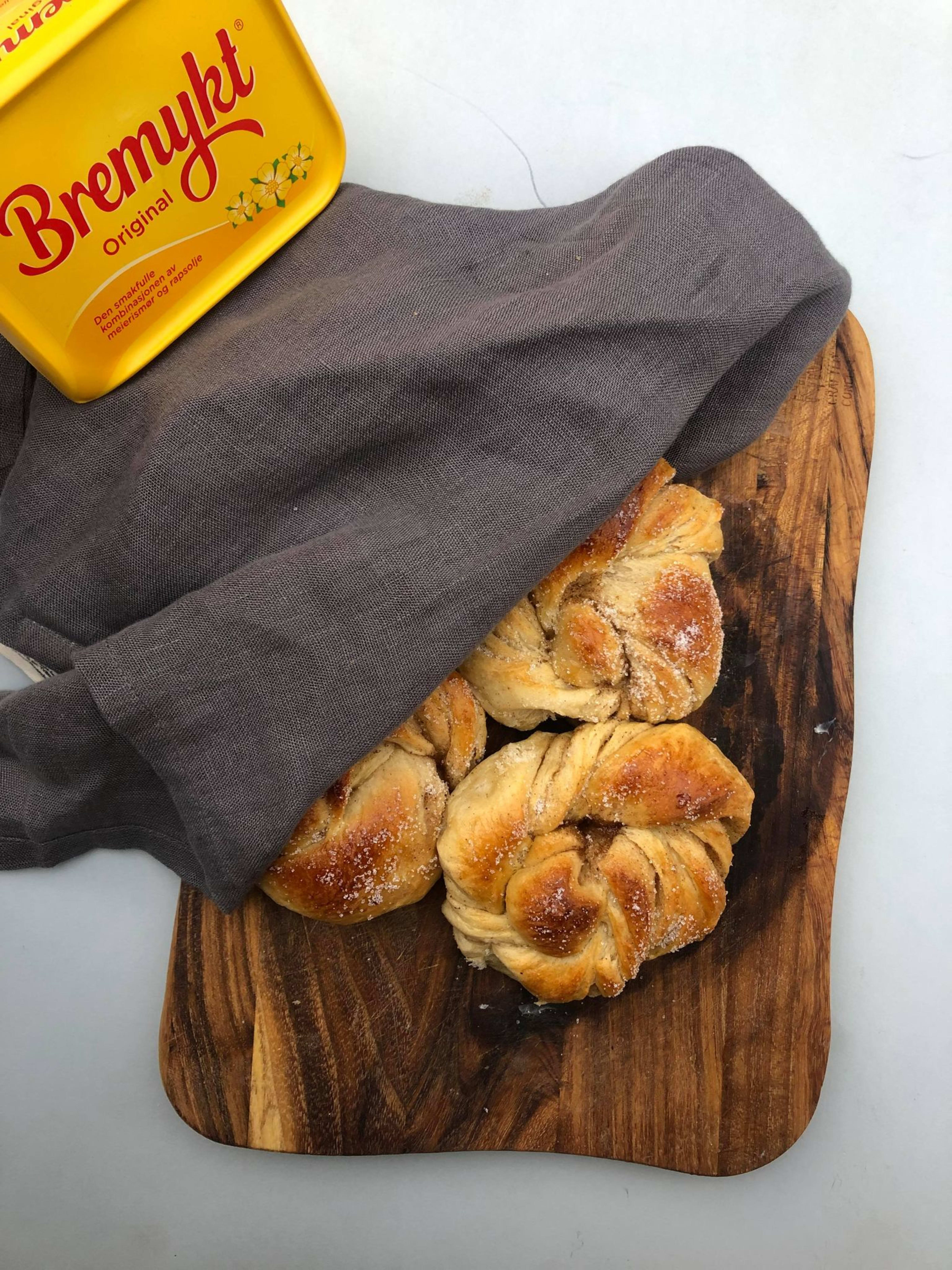 7. Nå fletter du strimlene og knyter en vanlig knute. Gjenta med alle strimlene og la dem heve i yttligere 40 min. på et bakebrett før du pensler dem med et pisket egg.