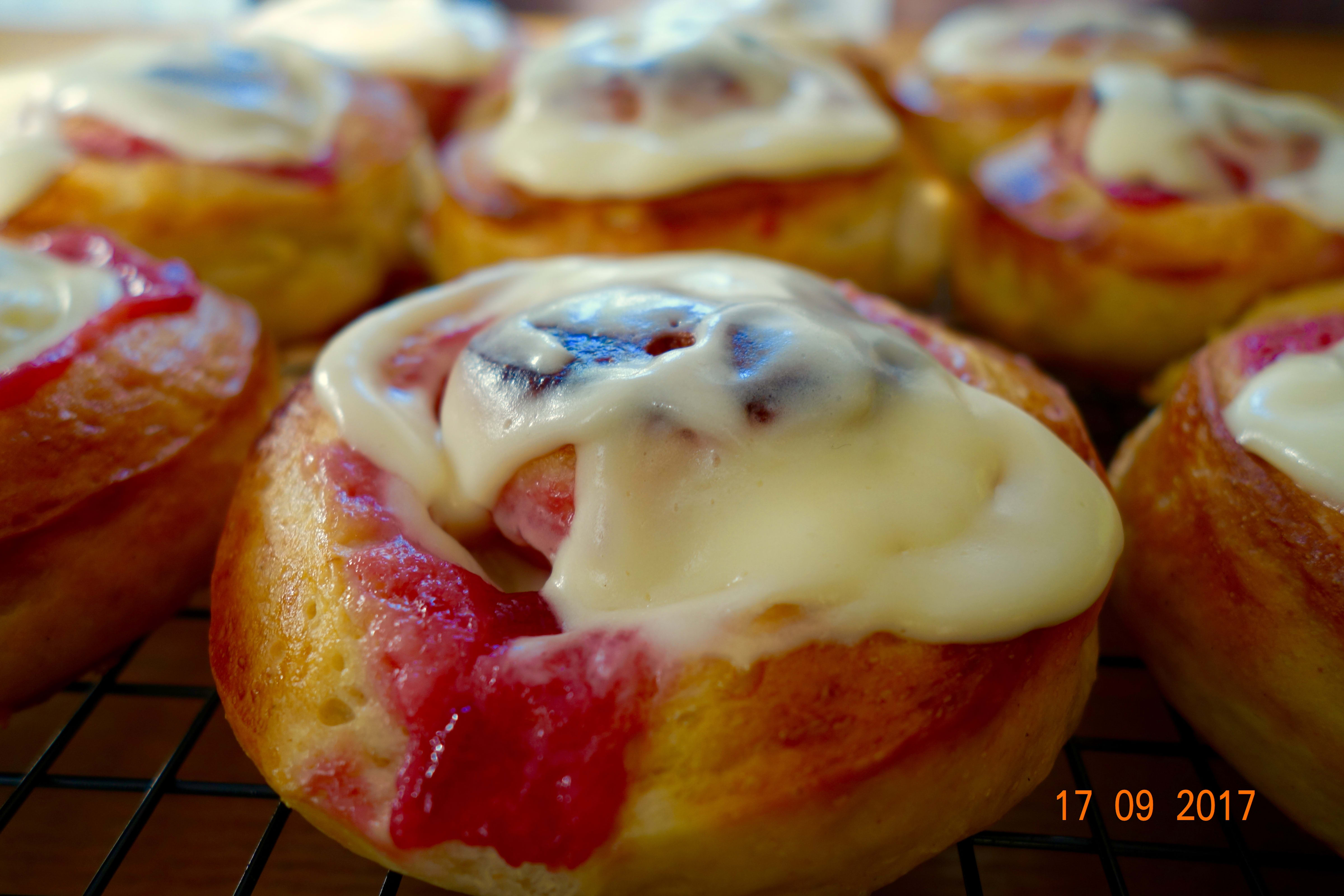 Hvelve deigen på bakebordet og kna den lett. La deigen hvile i 10 minutter før du deler den i to like deler. Deigen blir lettere å håndtere når den får hvile. Kjevle ut hver del til ca 46 x 30 cm. Bland ripsbærsyltetøy og kremost. Bre dette utover begge leivene jevnt fordelt. rull sammen til to pølser. Skjær ca 3 cm brede stykker av deigen og sette snurrene på bakebrett kledt med bakepapir. La snurrene heve under plast i ca 30 min. Pensle med sammenvispet egg.