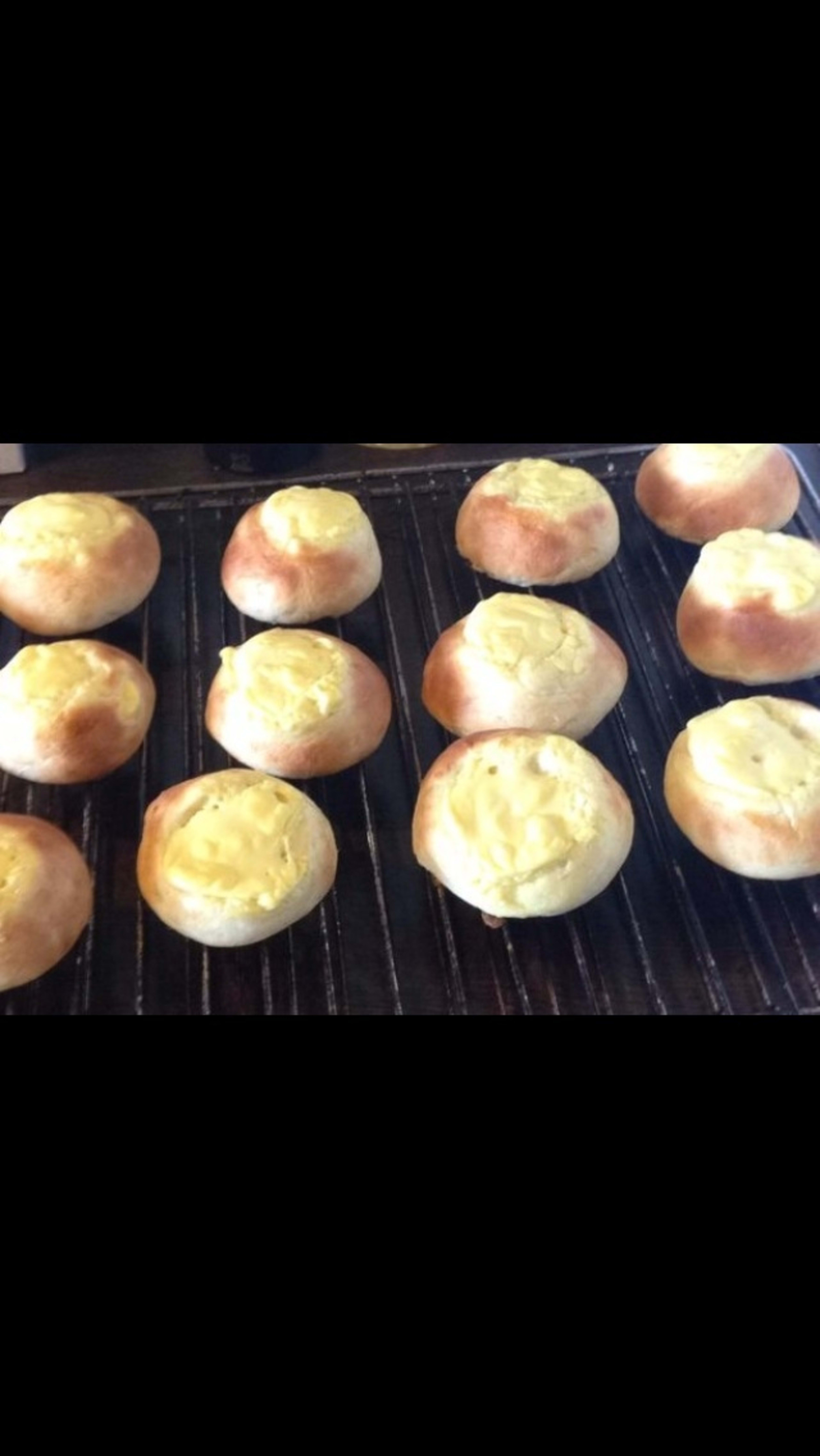 7. Hell vaniljekrem i en kremsprøyte. Lag en grop i hver bolle og fyll med vaniljekrem