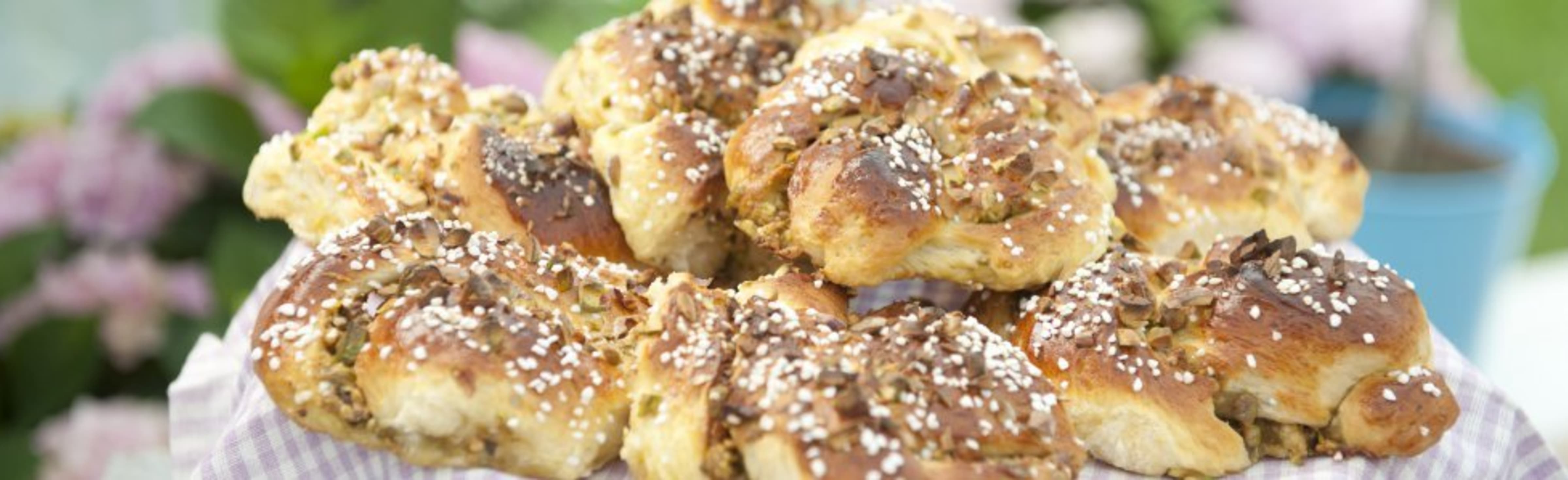 Bland ca. 400 g av melet med kardemomme og sukker. Smuldre gjæren i en annen bolle og løs opp denne i romtemperert melk. Tilsett ca. 1 ts sukker i melkeblandingen og rør godt. Hell melkeblandingen over i melblandingen og bland. Tilsett litt og litt mel mens kjøkkenmaskinen går, helt til deigen så vidt slipper bollen. Tilsett olje og smør i små terninger og elt i ca. 5 minutter til. Hev på et lunt sted i 40 minutter hvis du har det travelt, hvis ikke hever du til dobbel størrelse i romtemperatur.