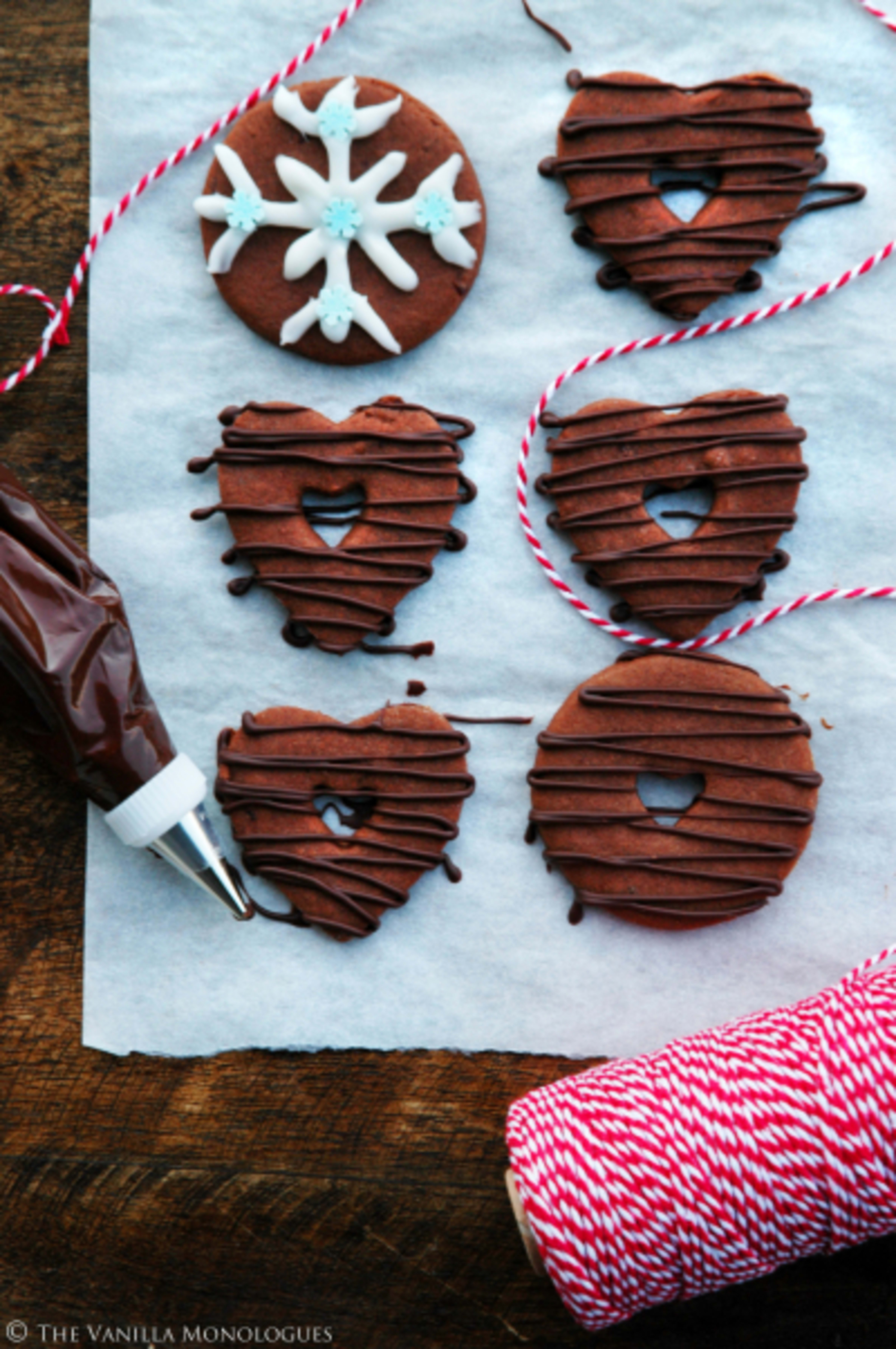 Avkjøl helt på rist før du pynter kjeksene med det du måtte ønske. For eksempel melisglasur, non stop, kakestrø, eller som jeg har gjort her, med smeltet sjokolade. Jeg bruker en sprøytepose med en tip med veldig lite hull for å få tynne fine linjer av glasur, men du kan også bruke et kremmerhus av papir om du vet hvordan du lager det. Det gjør nemlig ikke jeg, så jeg bruker alltid de plastikkposene til glasur!