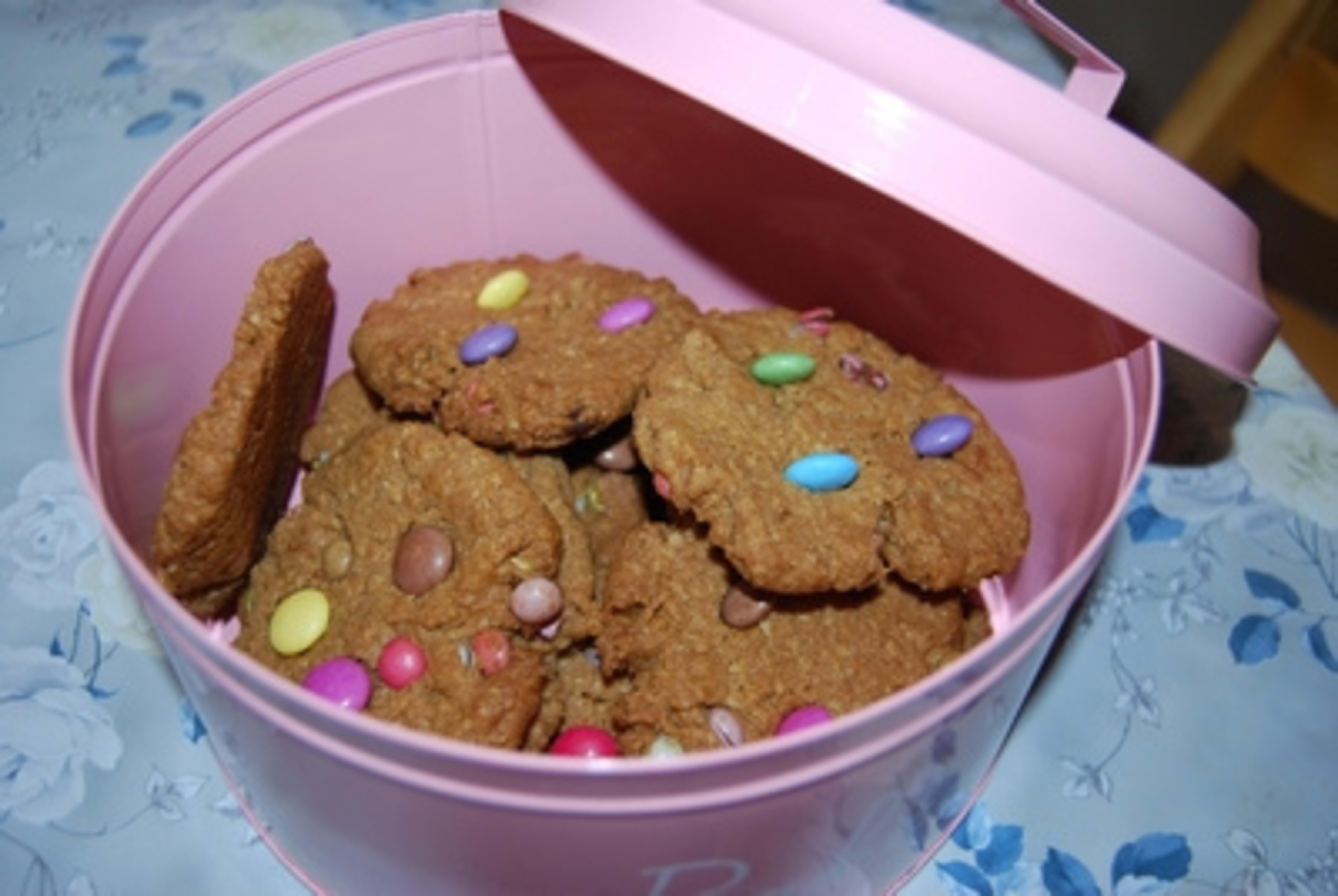 6.Stek midt i ovnen på 180 grader i ca 12-15 min. Trykk inn noen smarties på toppen når du tar de ut av ovnen. Avkjøl på rist.