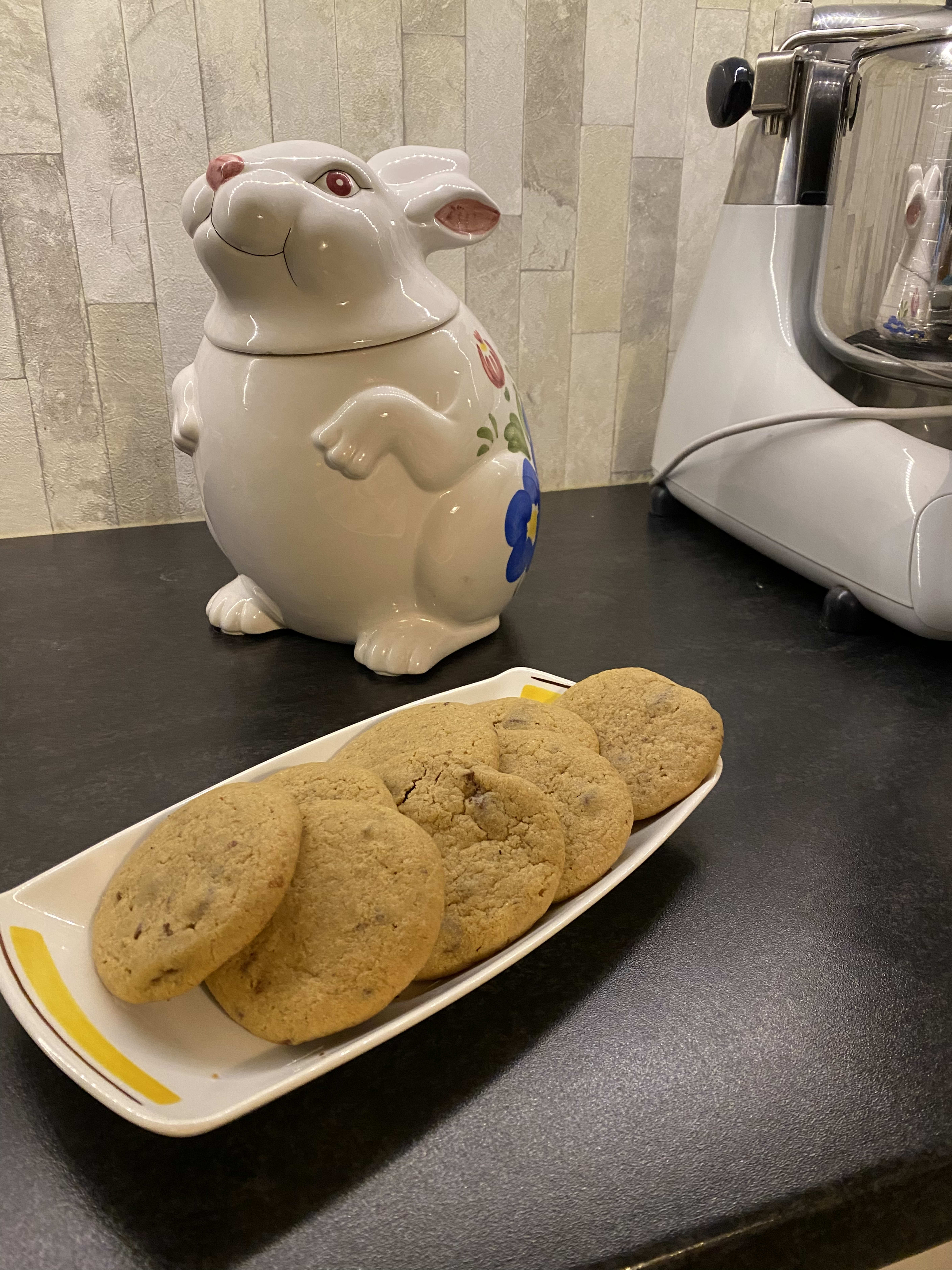 Pisk bremyk og sukker luftig, ha i et egg, bland inn alt tørt og tilsett til sist grovhakket sjokolade.