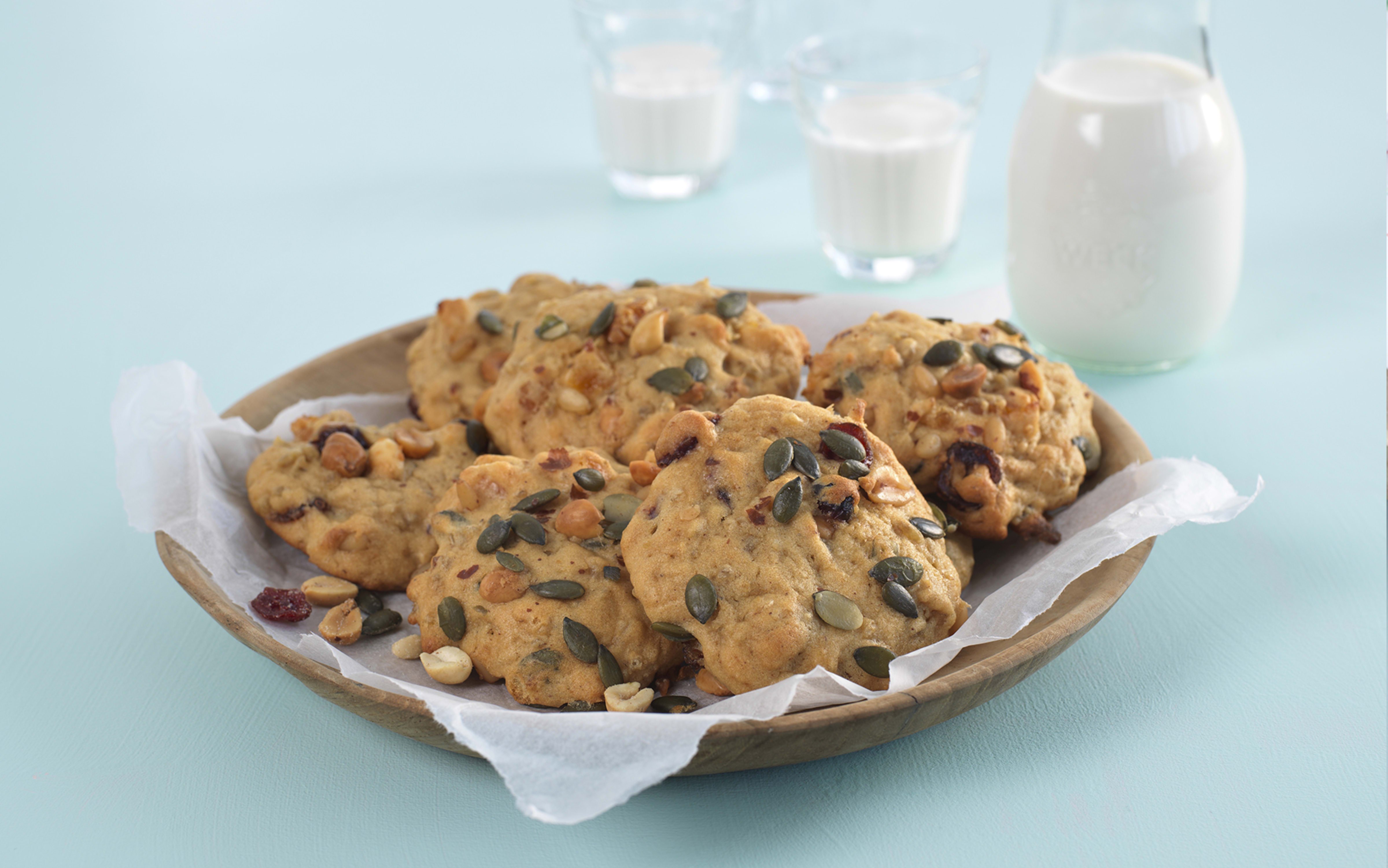 Pisk sammen Bremykt og sukker til det er kremet. Tilsett egg og grøt, bland godt sammen til en glatt røre. Bland de tørre ingrediensene og sikt over røra. Vend det inn sammen med nøtter, aprikos og tranebær. Bruk to spiseskjeer og sett litt store topper på stekebrett, med litt mellomrom. Stek kjeksene på midterste rille, ca. 12-15 minutter. Avkjøl på rist