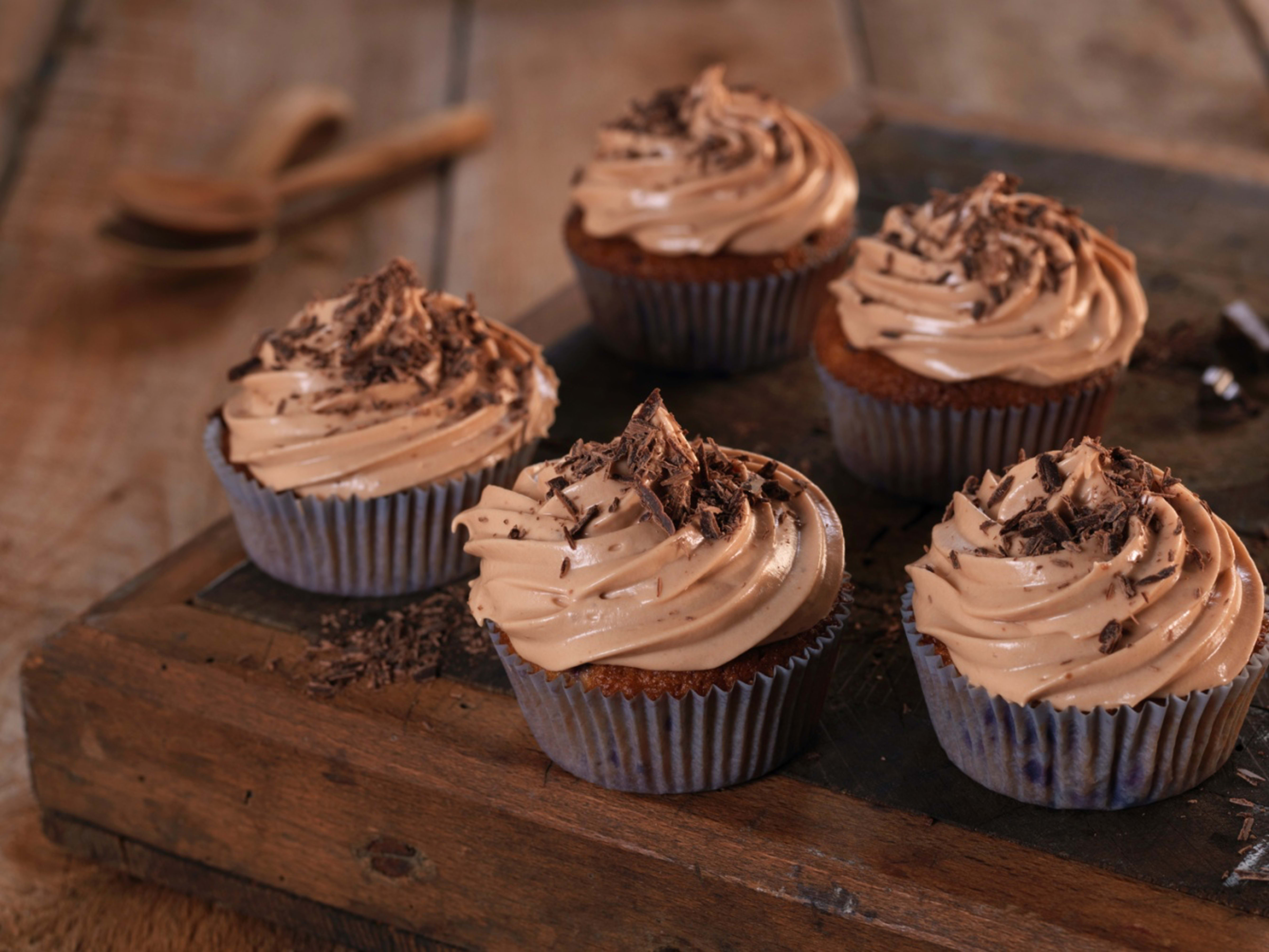 Tilsett lun melkesjokolade og pisk videre til du har en luftig krem som er fin å sprøyte. Fyll i en sprøytepose med stor stjernetyll. Hold posen ca. 5 cm over cupcakene, la frostingen dette ned ytterst på kaka, drei rundt og avslutt i midten. Pynt med litt revet sjokolade.