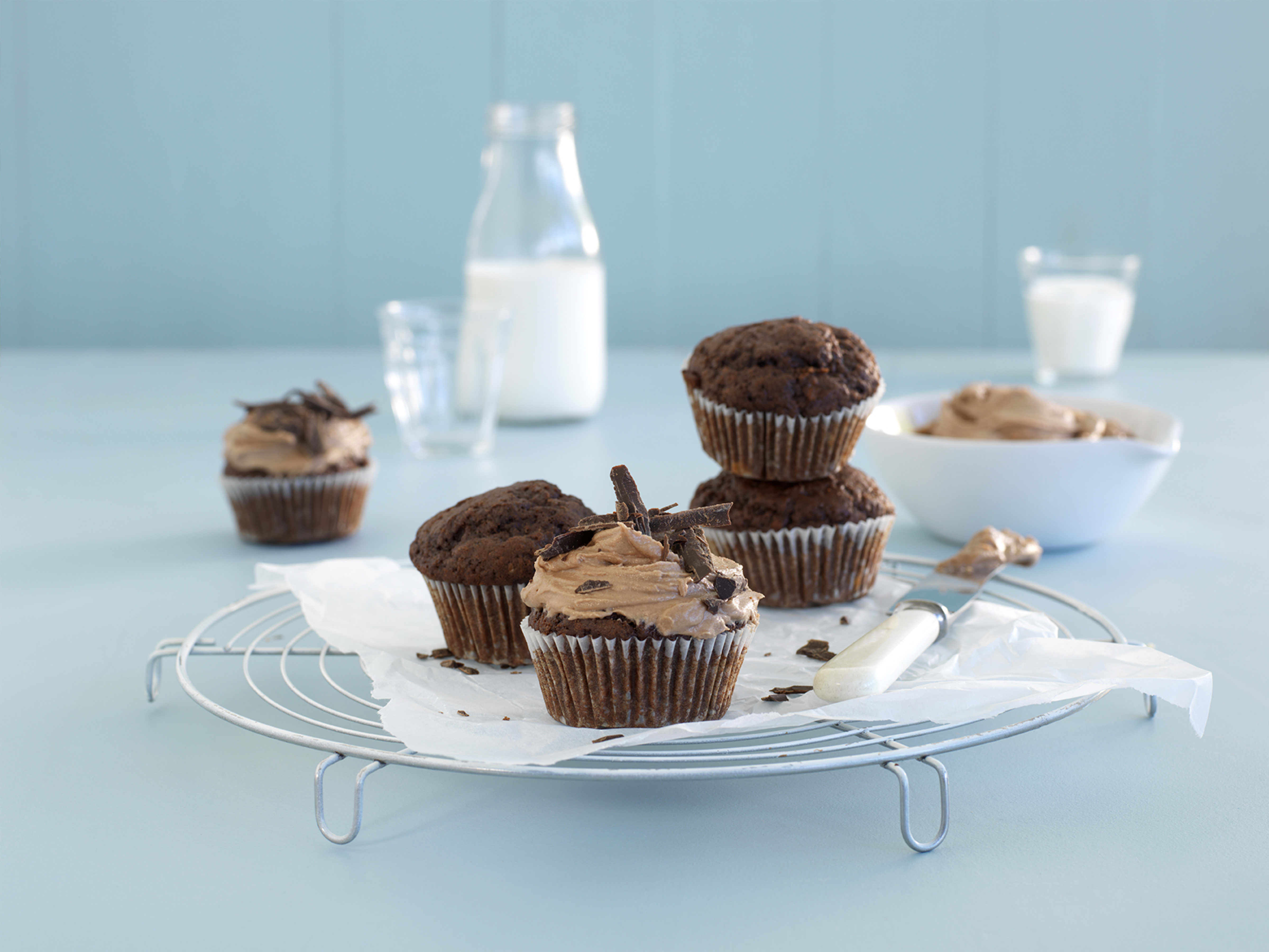 Fordel røra i muffinsformene, ca. ¾ fulle og stek på midterste rille 15 minutter. Sjekk med en kakepinne, det skal ikke sitte igjen deig. Avkjøl på rist.