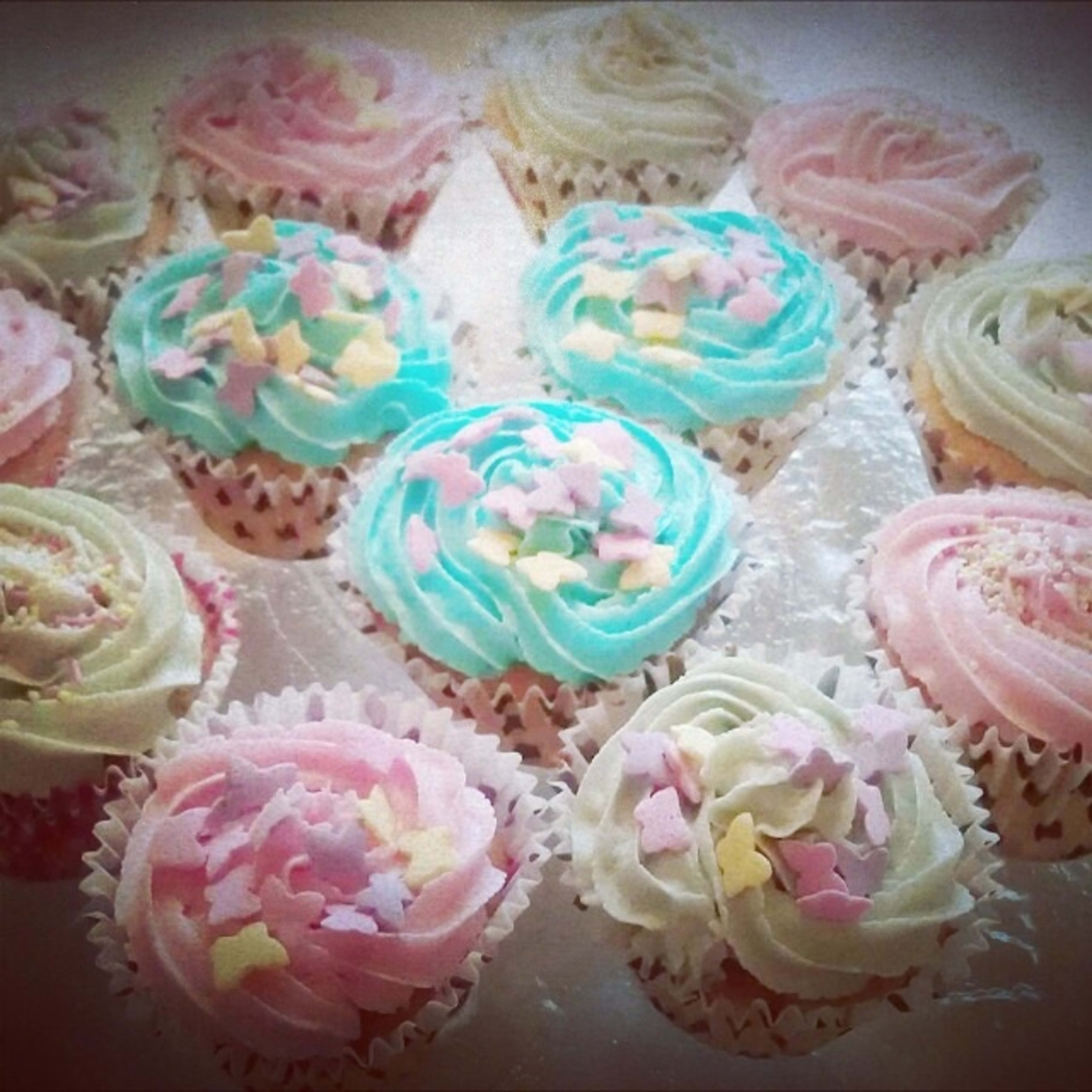 Bruk en krem-spruter til å fordele kremen på hver av cupcaksene . Pynt gjerne med litt kakepynt på toppen !!