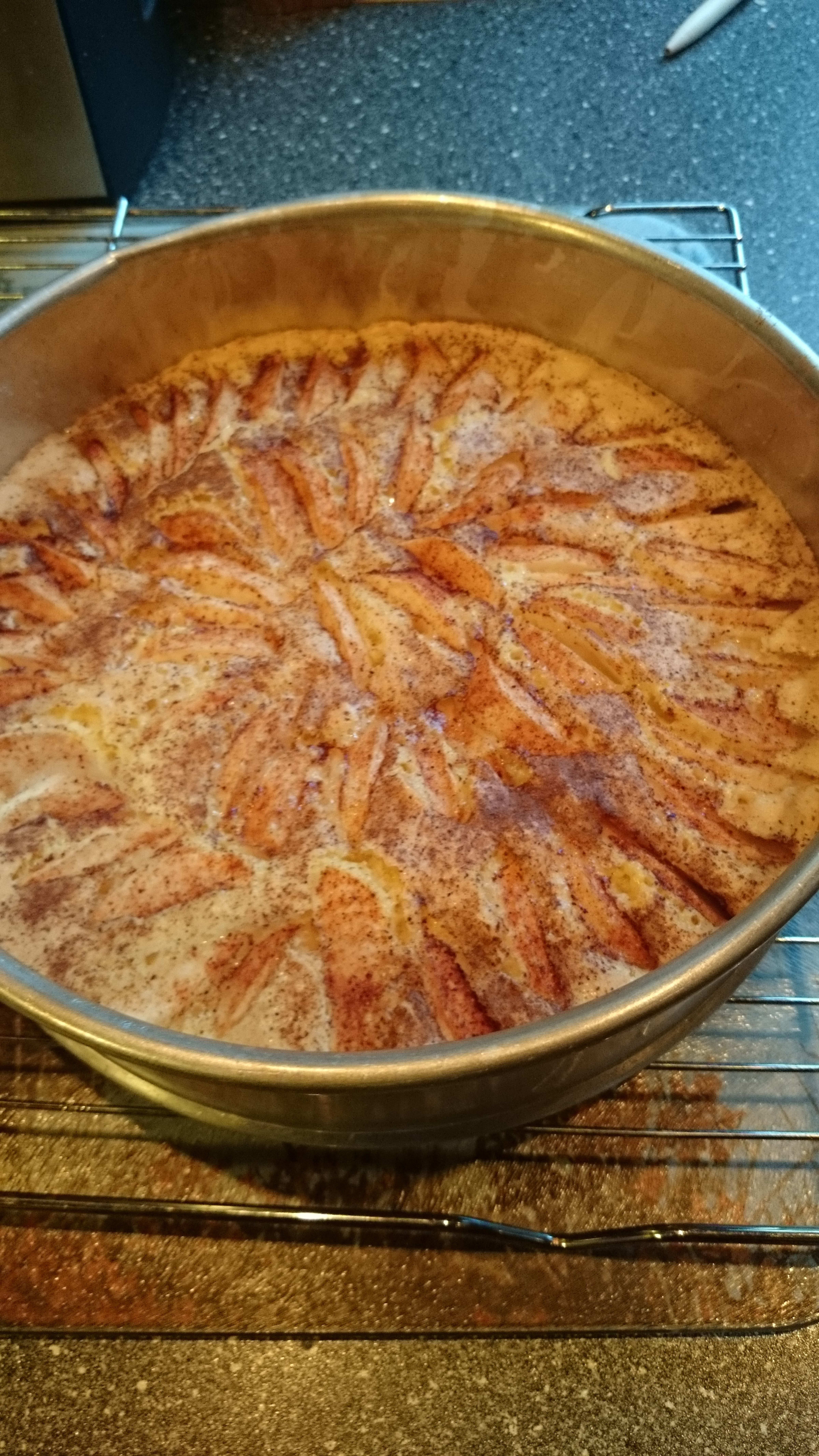 Ha røren i en smurt form, (ca 24 cm) legg eplene over røren, dryss sukker og kanel over.
