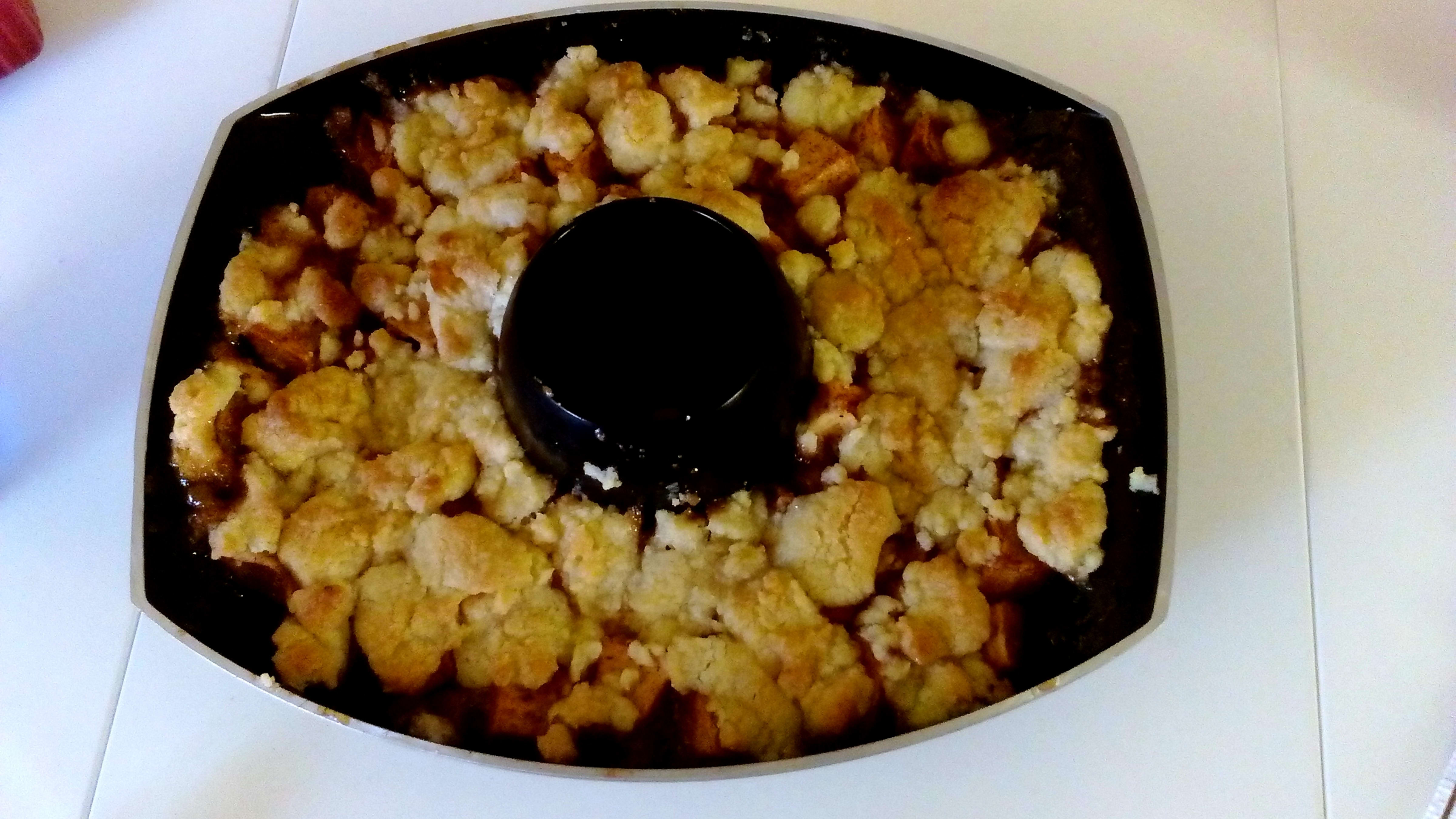 Ha eplene i en liten ildfast form smuldre deigen over sett formen midt i ovnen i ca 20 min. La kaken avkjøle litt føre den serveres med is.