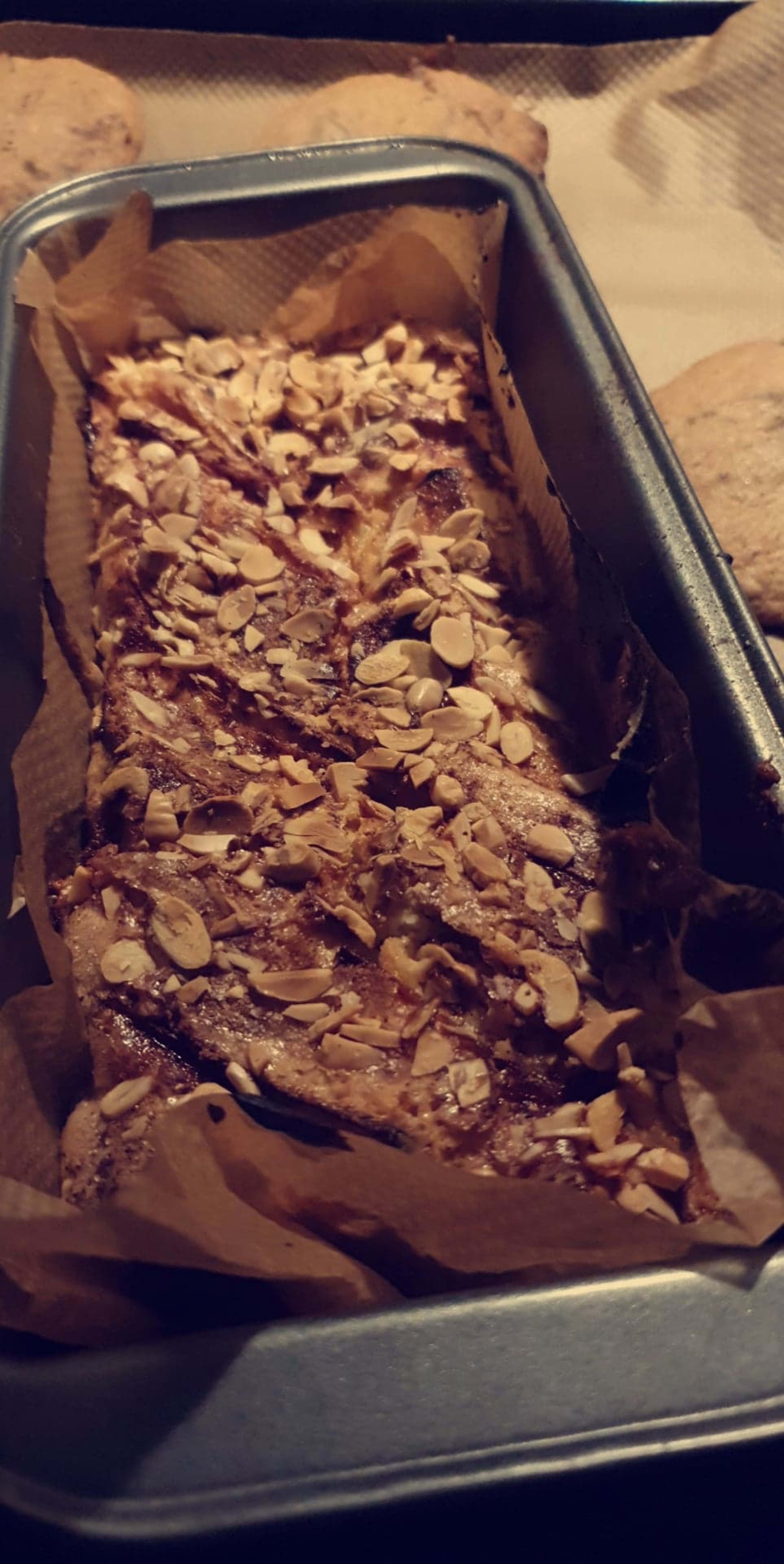 3. Ha røren i brødform med papir, ha på skrellede epleskiver og kryss over sukker, kanel og hakkede mandler.