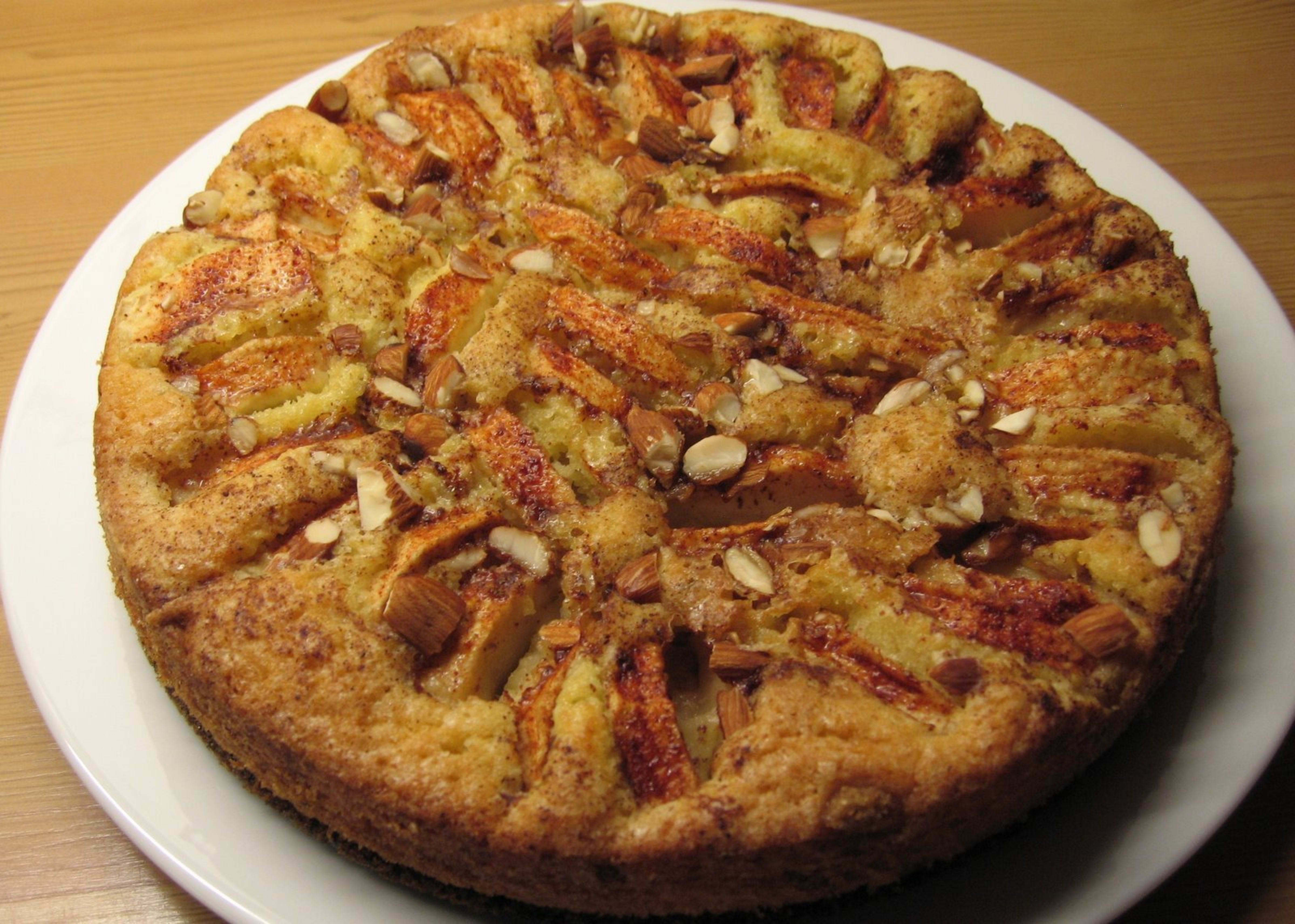300 gr smør (bremykt) smeltet . 250 gr sukker . 300 gr mel . 1 ts bakepulver . 5 egg 6 store epler. Mamdler . 2 ss Kanel