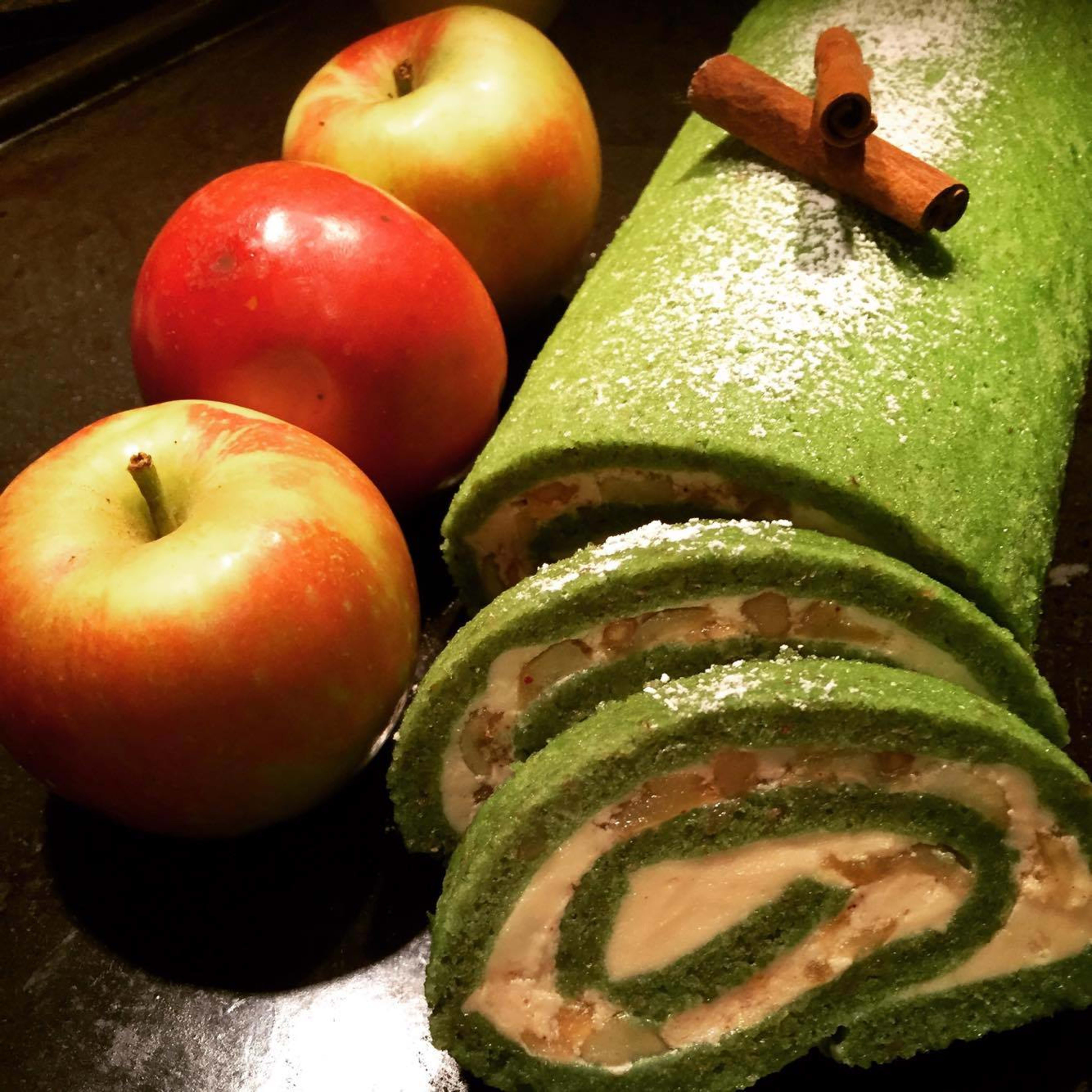 13. Fjern bakepapiret fra toppen av den avkjølte rullekaken. Smør karamellkrem utover i et jevnt lag. Spre deretter de stekte eplene utover.