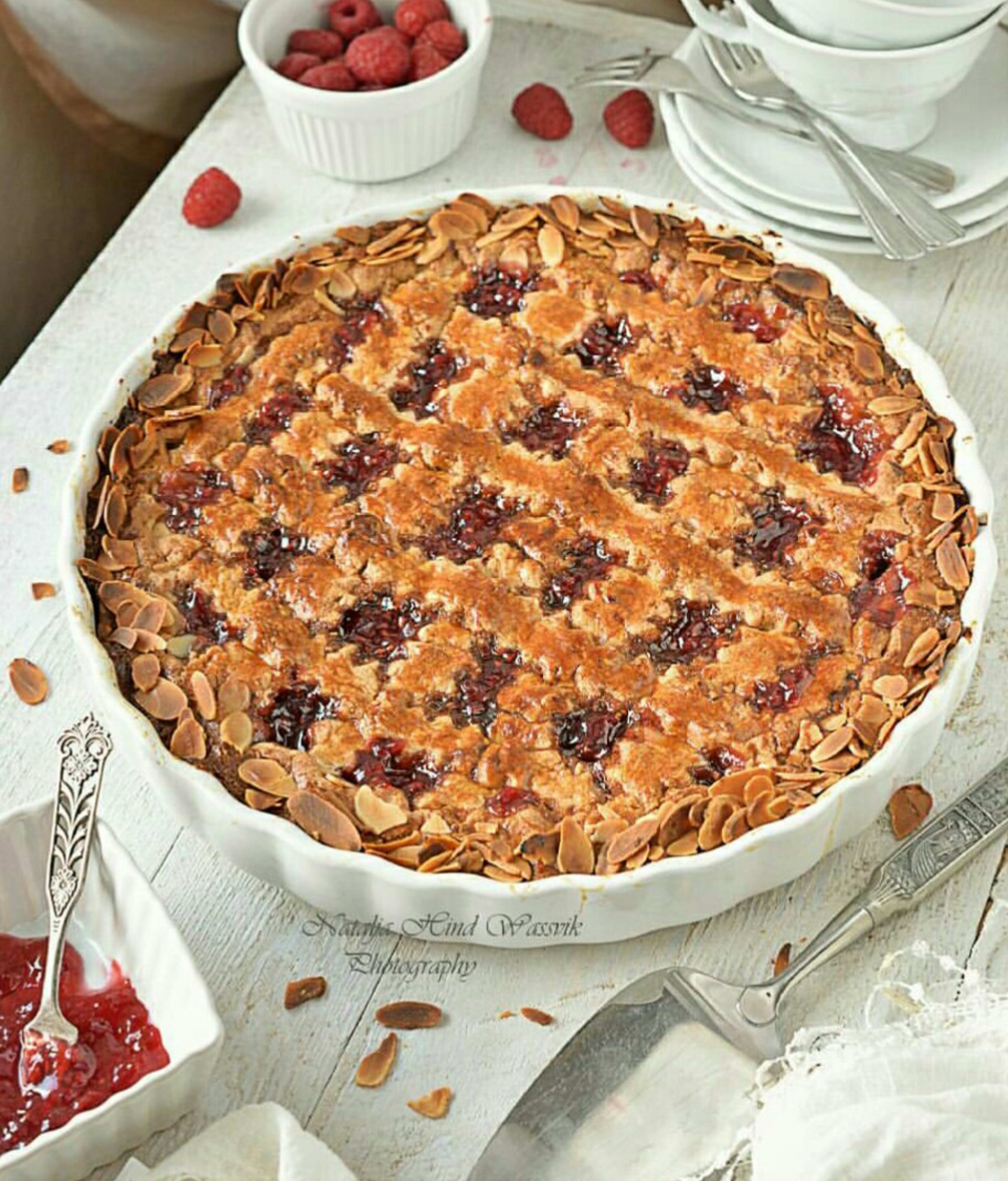 Kna deretter inn siktet mel og bakepulver. Knus nøtter fint i en blender og bland dem godt med deigen. Legg den en halv time i kjøleskapet. Ta den ut og rull ut tre fjerdedeler av deigen med kjevle til en ½ cm tykkelse på melet underlag. Dekk bunnen og sidene av en smurt springform på 24 cm med deigen. Legg bringebær og rips på den og pensle den med bringebærsyltetøy. Et tynt lag er nok. Form med en kringlekutter (bølgende striper) fra den resterende deigen og legg dem i et rutenett på syltetøyet. Pensle dem med litt egg og dryss skivede mandler rundt kanten. Stek i 40-45 minutter ved ca 190 C. La den avkjøles og ta den ut av formen. Server og spis.
