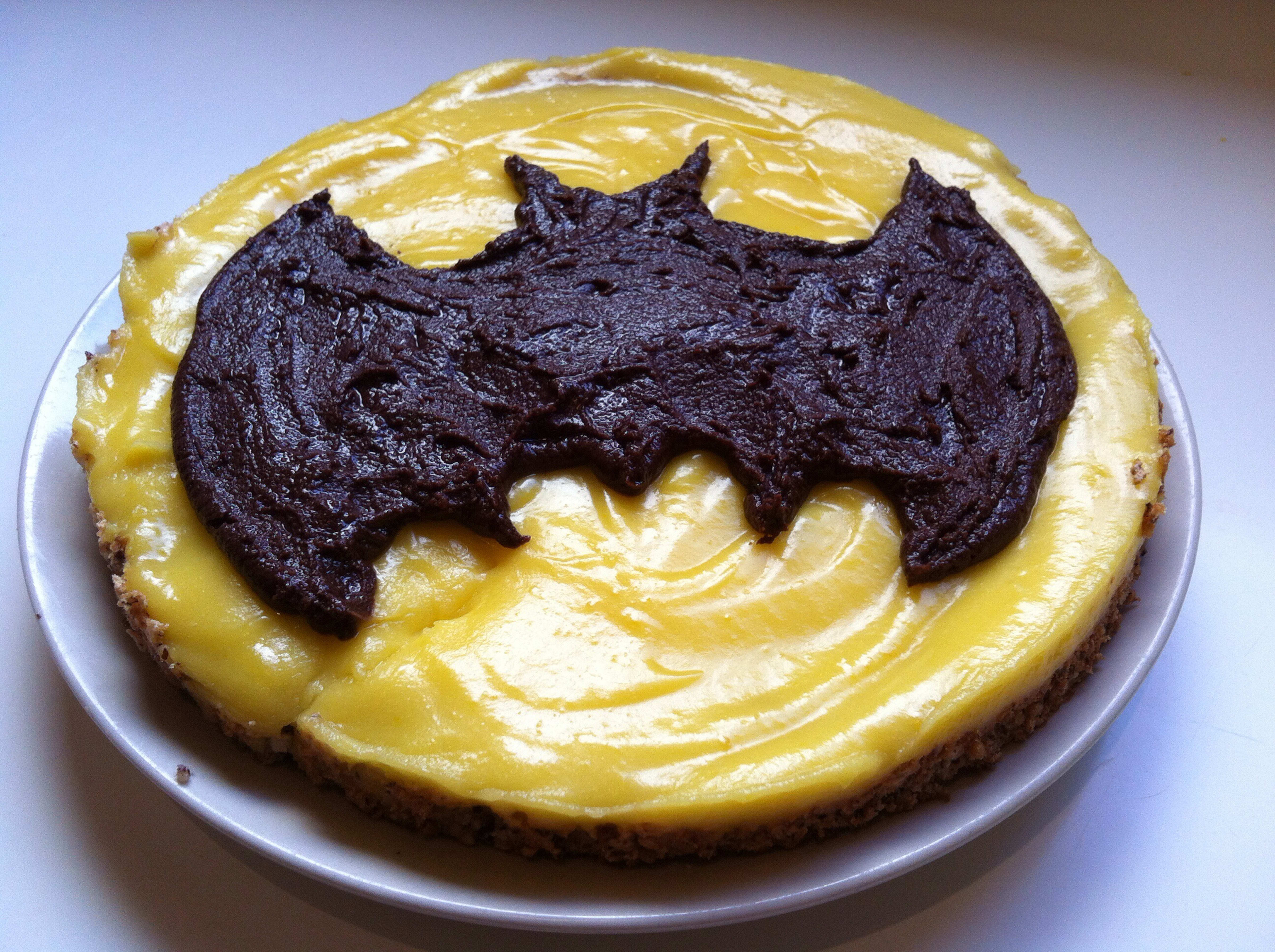 Legg nøttebunnen på et serveringsfat. Bre eggekremen over. Ha sjokoladeglasuren i en sprøytepose og tegn batmanlogoen oppå eggekremen.
