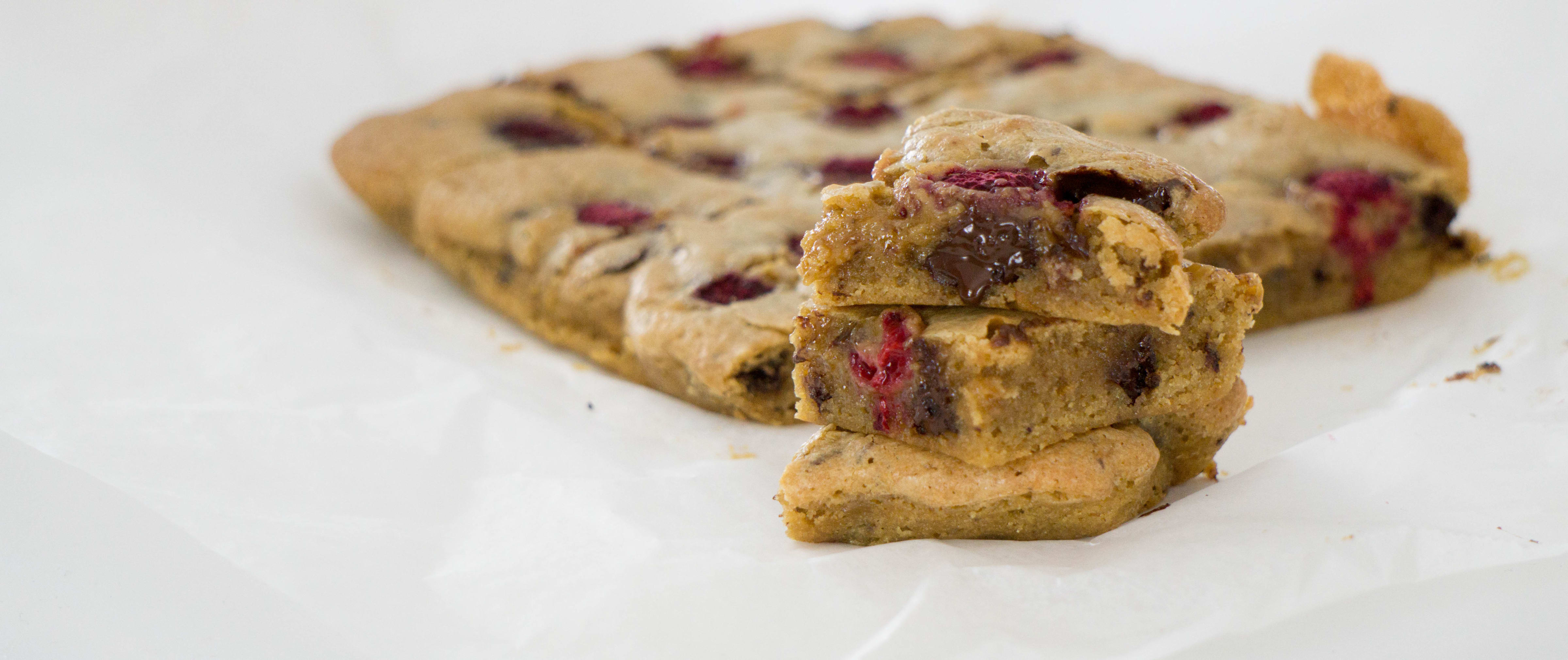 Ha så i hvetemel og rør sammen. Vend inn hakket sjokolade. Ha røren over i en bakepapir kledt form, jeg brukte en liten langpanne på 26*17cm. Press bringebær ned i røra.