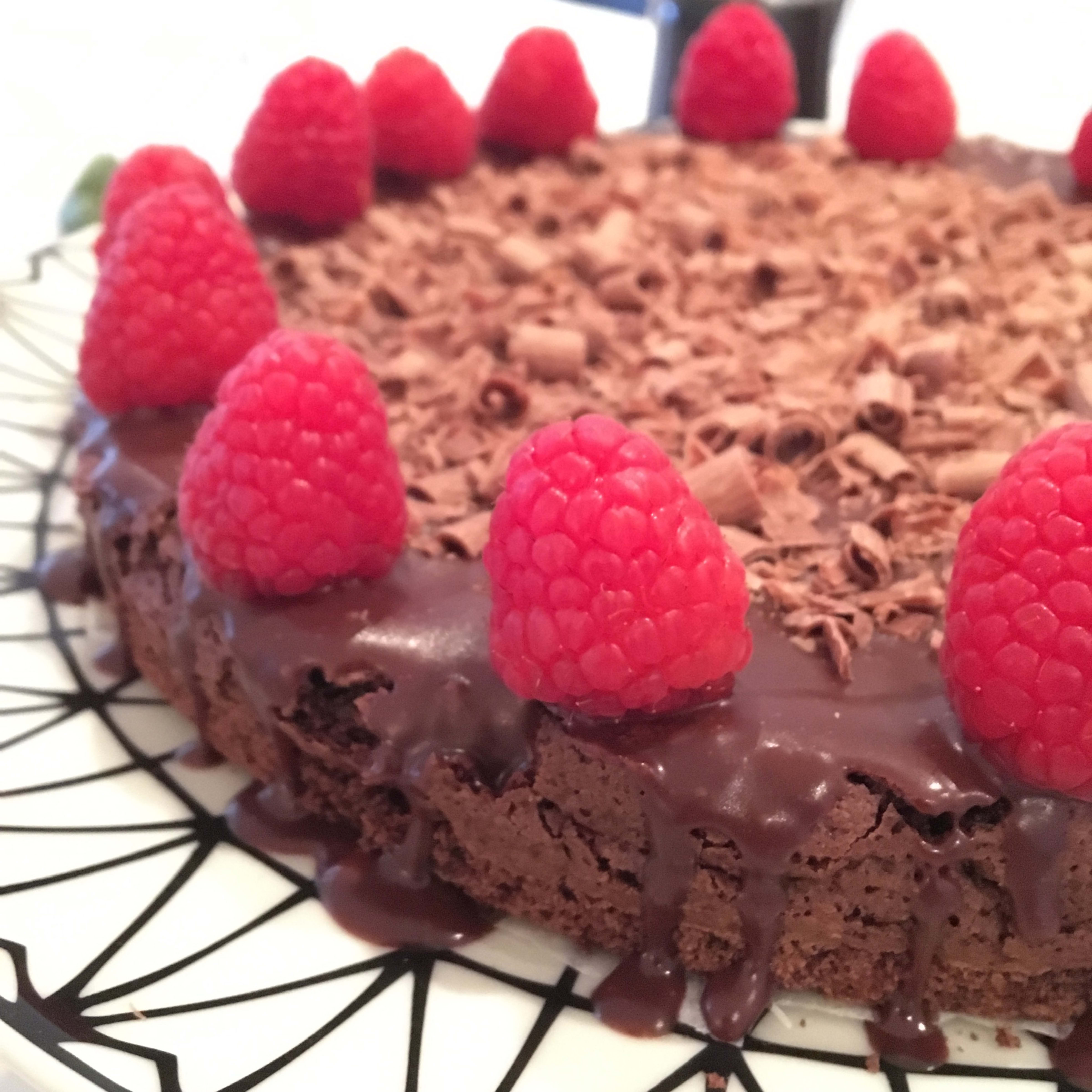 Viktig at kaken ikke steker for lenge, skal fremdeles være litt løs når den tas ut. Avkjøl og pynt med en enkel melkesjokolade ganach og friske bringebær