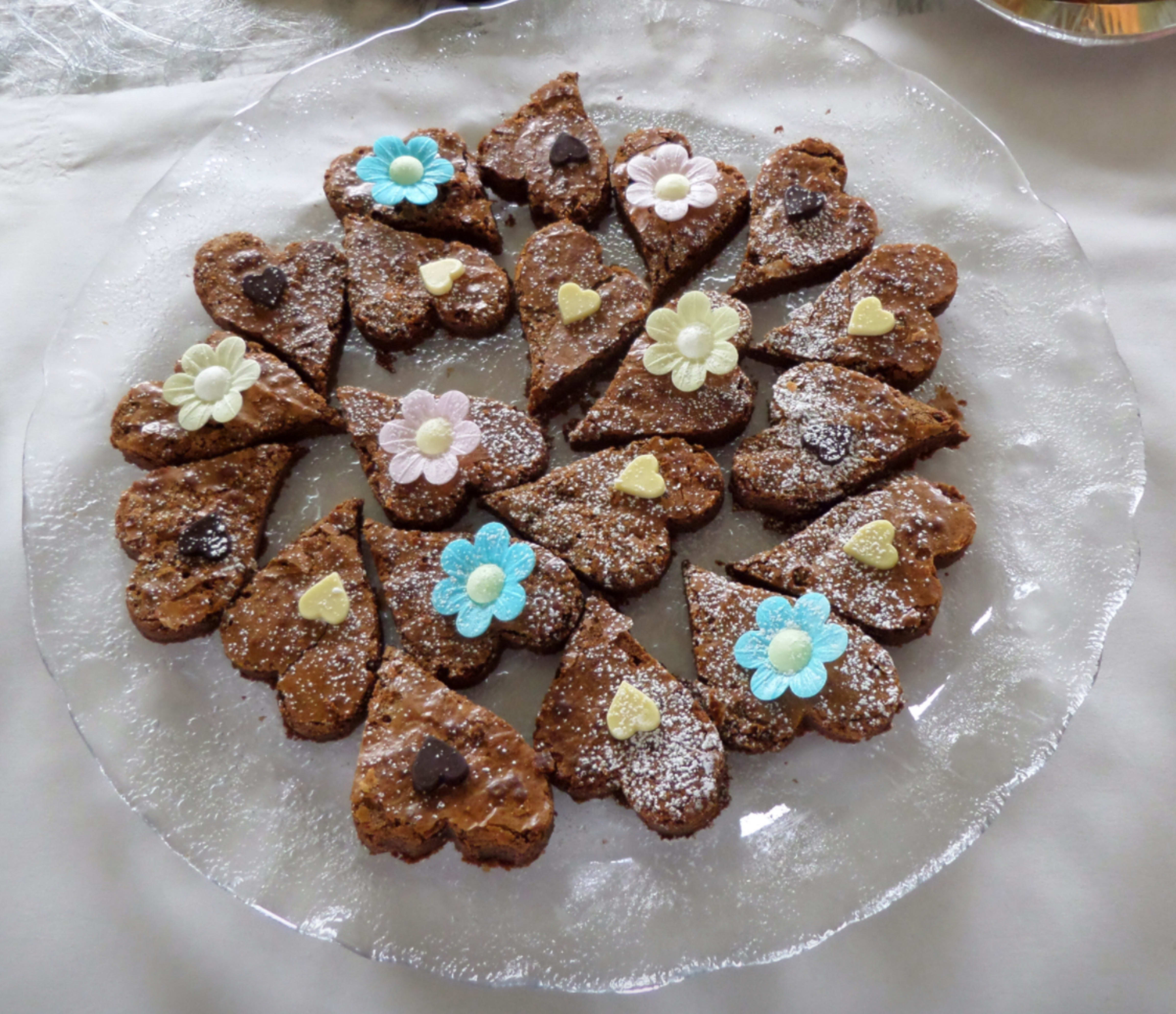 6. Trykk ut bitene med hjerteform og pynt med melis, sjokoladehjerter, blomster eller smeltet karamell
