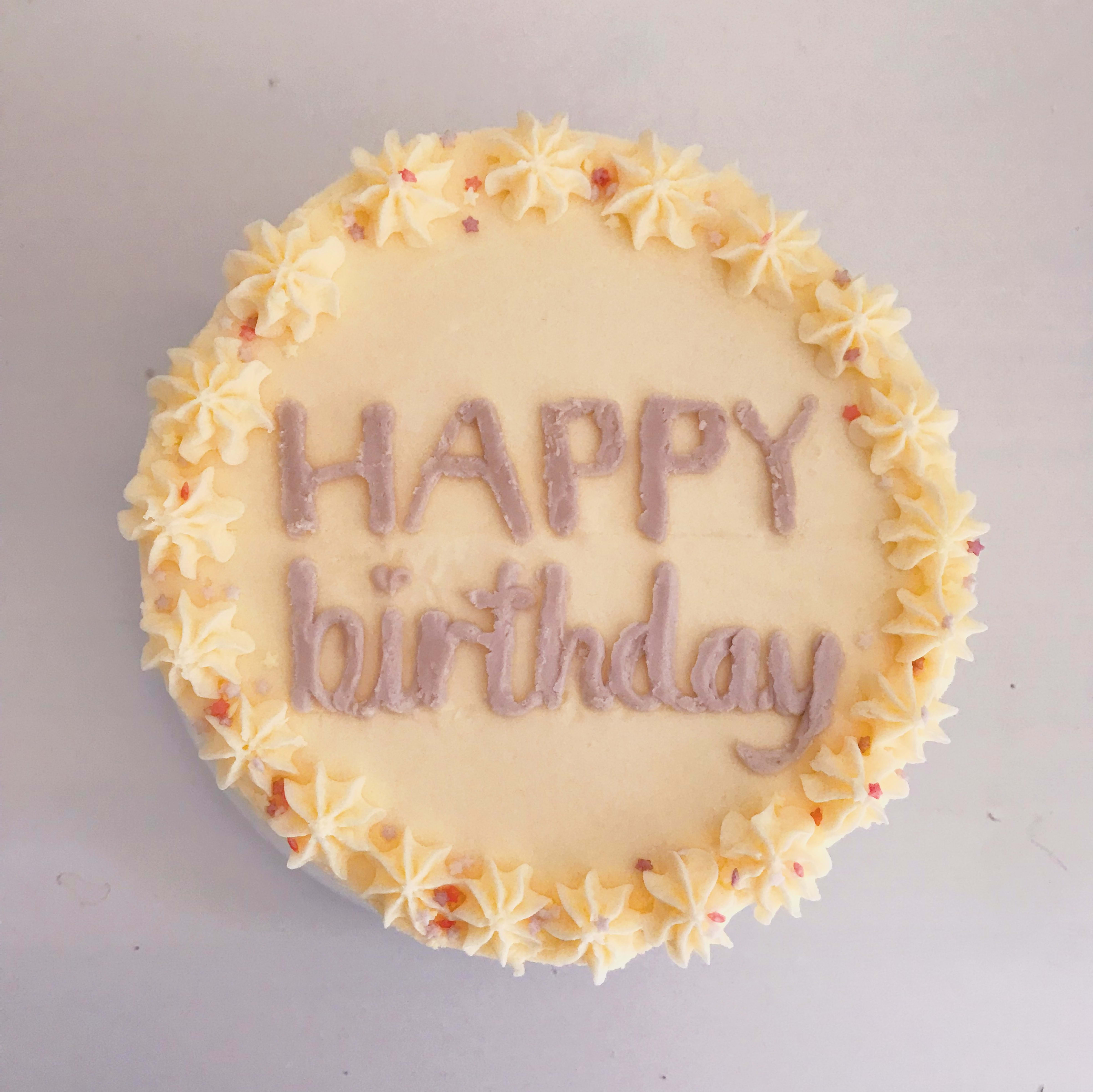 8. Farg en liten del av smørkremen med konditorfarge, og skriv en liten bursdagshilsen på kaken :)