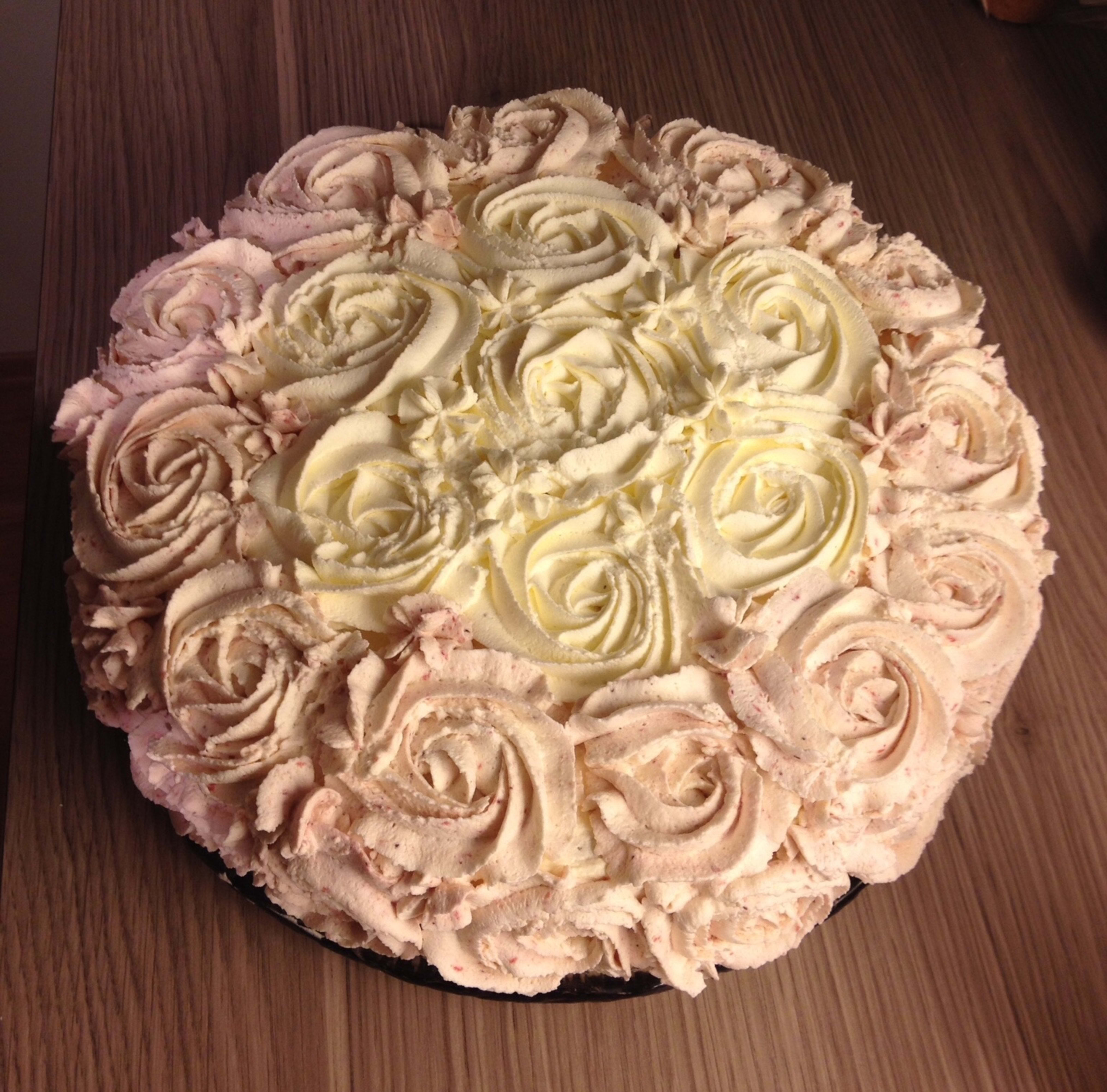 Pisk kremfløten stiv med vaniljesukkeret. Ha tyttebærsyltetøyet gjennom et sil, løft denne massen forsiktig i 2/3 del av kremmen. Pynt med store roser som på bildet, bruk resten av kremmen til å sprøyte roser i mitten av kaka.