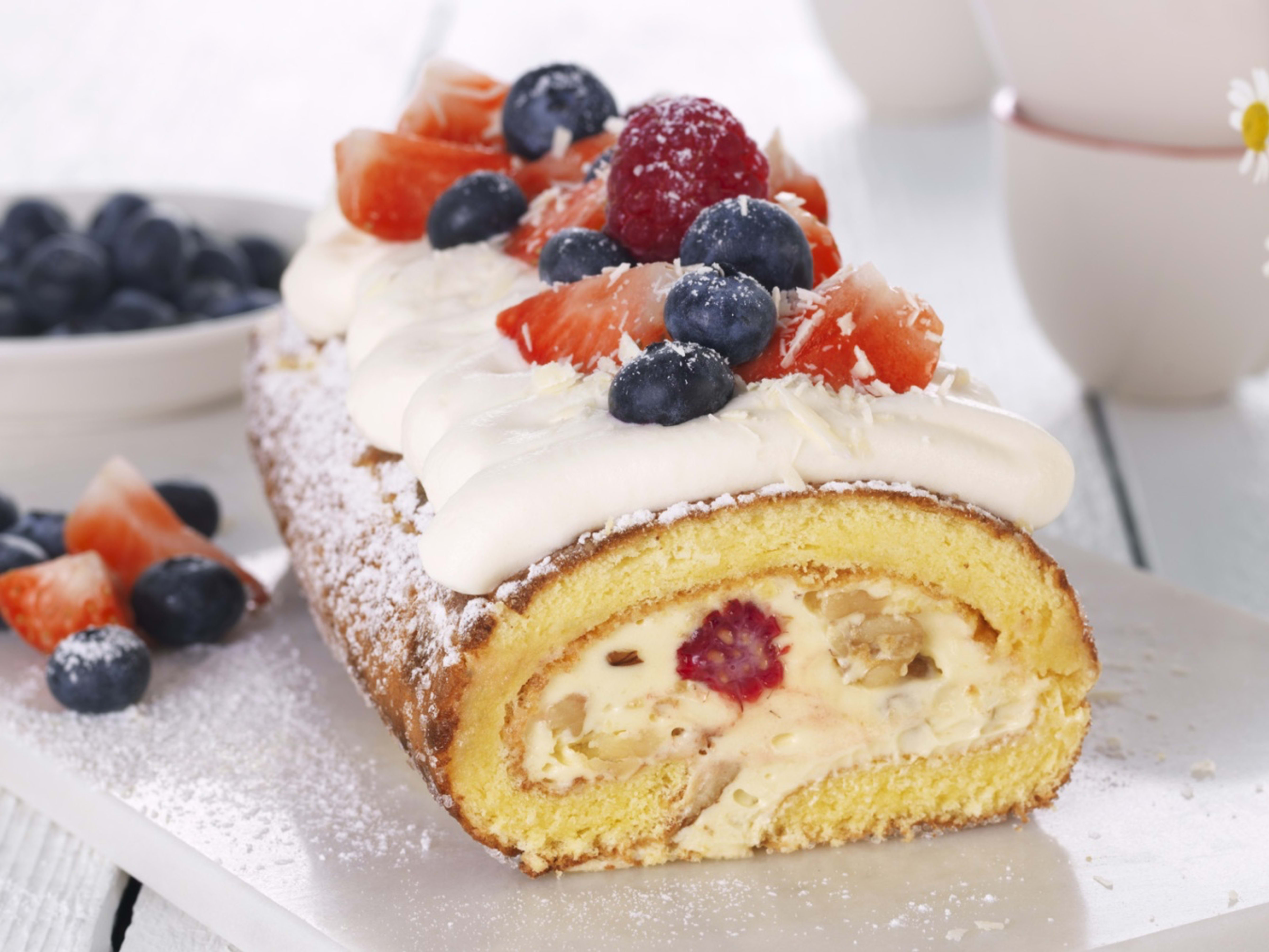 Ta av papiret. Pisk sammen fløte, sukker og vaniljesukker. Ha i sprøytepose med rund tipp og sprøyt et fint mønster på toppen av kaka. Pynt med friske bær, sjokolade og et lett melisdryss.