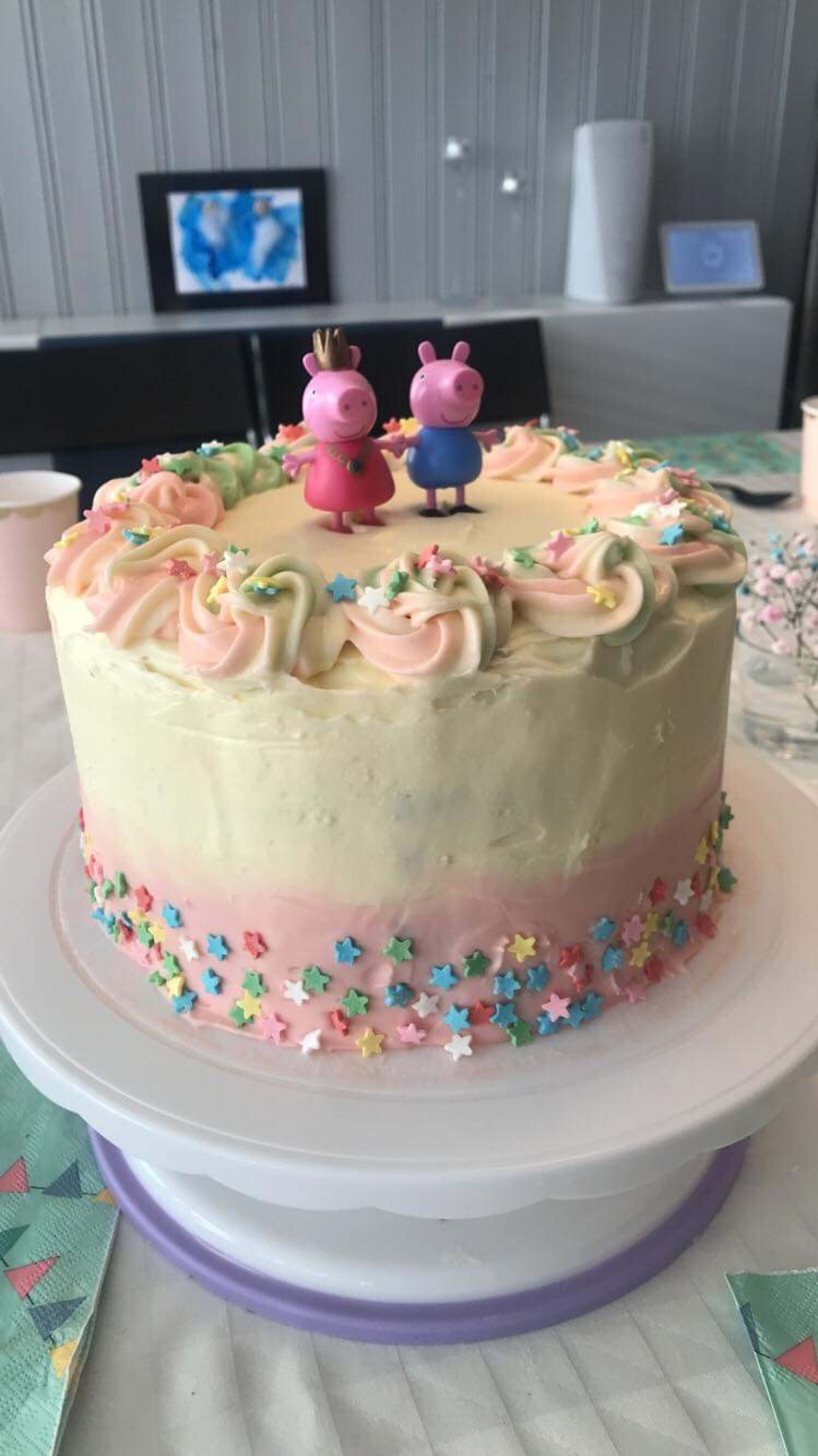 Del kaken i to, legg i et lag med glasur til fyll og dekk så hele kaken i et deilig, tykt lag med glasur.