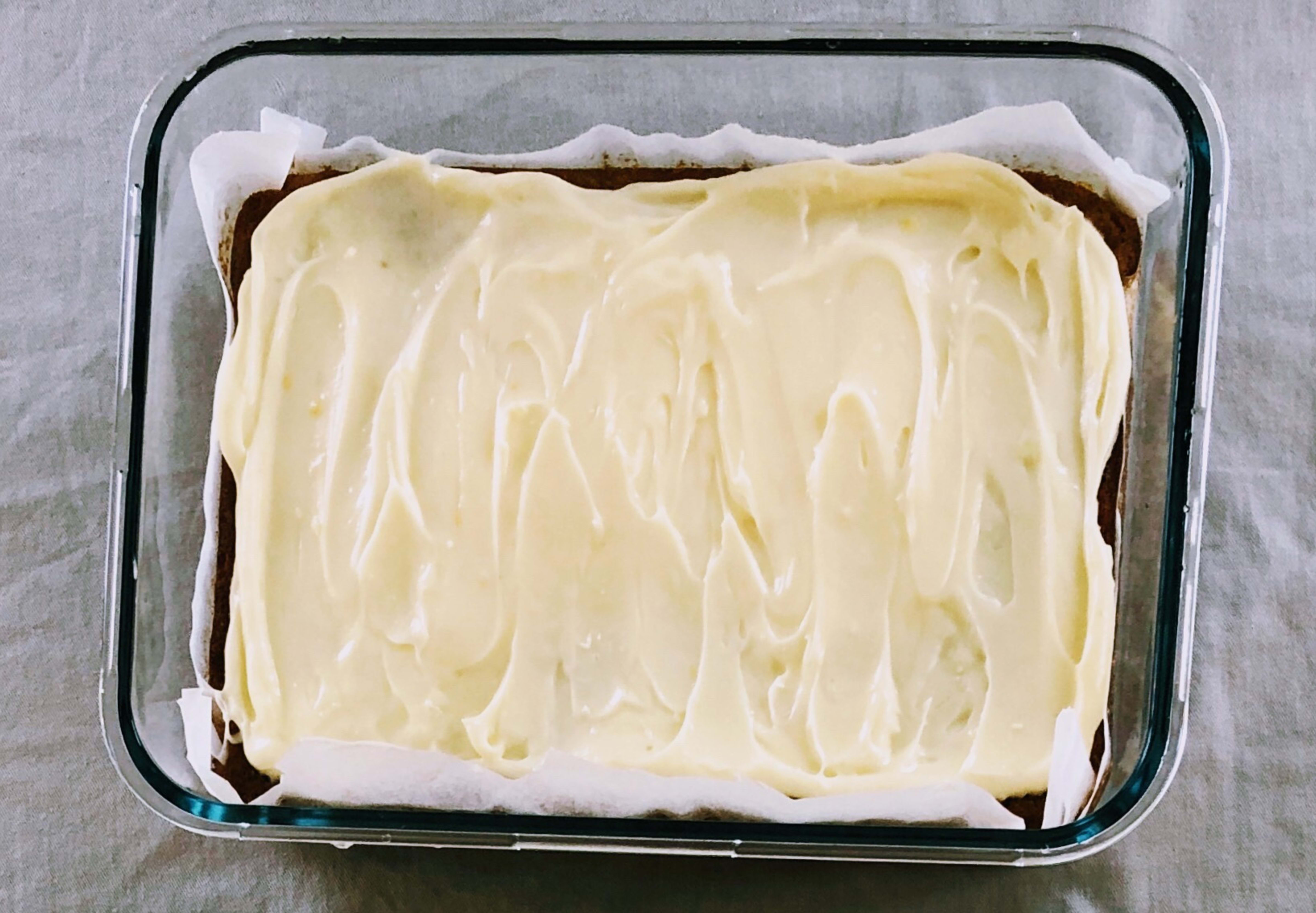 Start med å legge ostekrem mellom lagene. Sett så kaken i kjøleskap så kremen blir noe fast før du dekker med smørkrem. ca 15 min i kjøleskap.