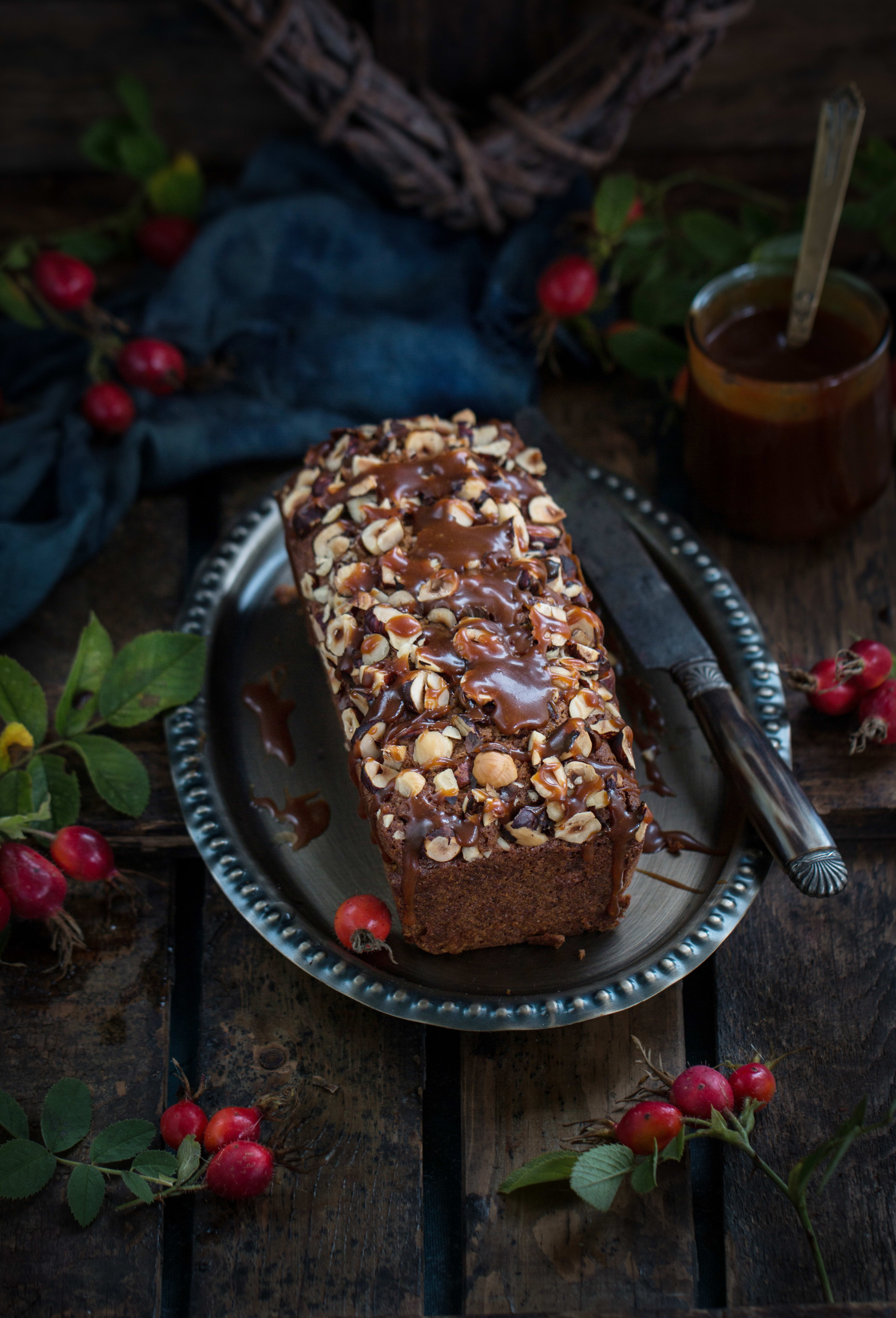 Hell røren i en bakepapirkledd brødform. Dryss over hakkede nøtter.
