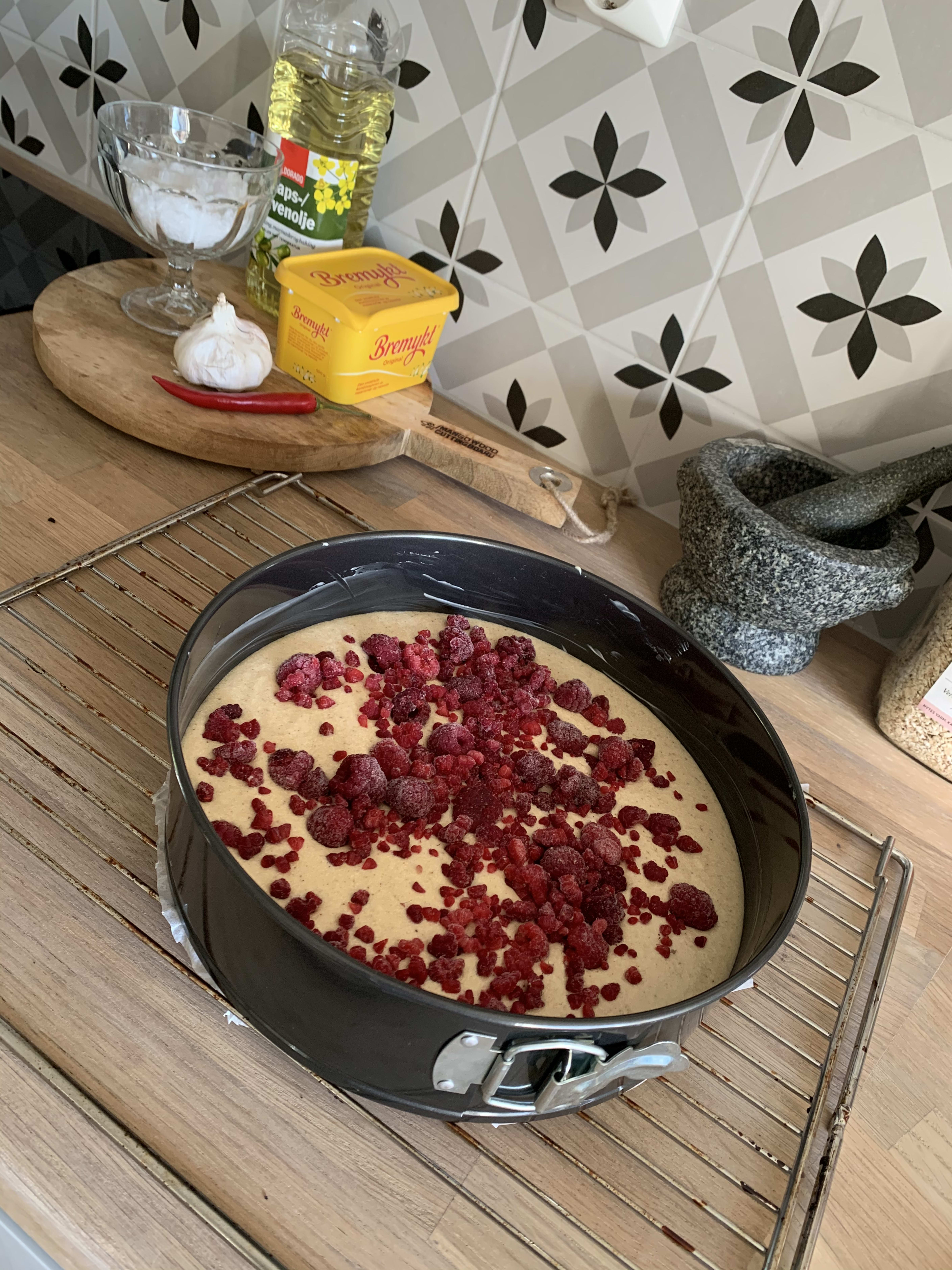 Sett ovnene på over og under varme på 180 grader. Bland alle tørre ingredienser i en bolle, deretter tilsett melk, egg og smør, rør godt sammen. Hell blandingen i en springform (NB! Husk å smøre formen med Bremykt først), tilsett bringebær etter ønske og rør forsiktig inn. Ta 3ss med sukker og 1,5ss kanel i en kasserolle og sett på middels varme til det blir en klumpete blanding av sukker og kanel. Hell deretter dette over kaken, eventuelt rør noen biter inn og la noe ligge på overflaten. Plasser kaken i ovnene på nest nederste rille, i ca 40 min. Sjekk kaken underveis ved å stikke en gaffel gjennom kaken, om ingenting henger igjen er den ferdig! OBS! For å få den noe «fudgy» er kaken også ferdig om litt er igjen på gaffelen.